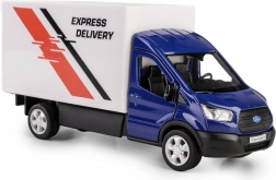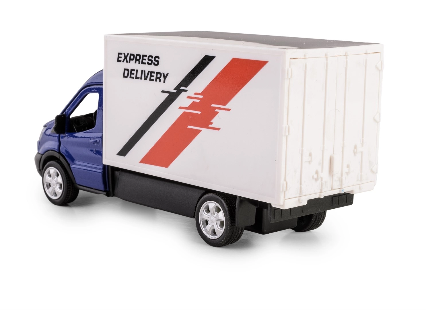 Grâce aux portes ouvrantes, vous découvrez l’intérieur, et le mécanisme à rétrofriction propulse la voiture vers l’avant après l’avoir tirée en arrière. Le réalisme est renforcé par la peinture bleue, les roues argentées et le marquage Express Delivery bien visible.
