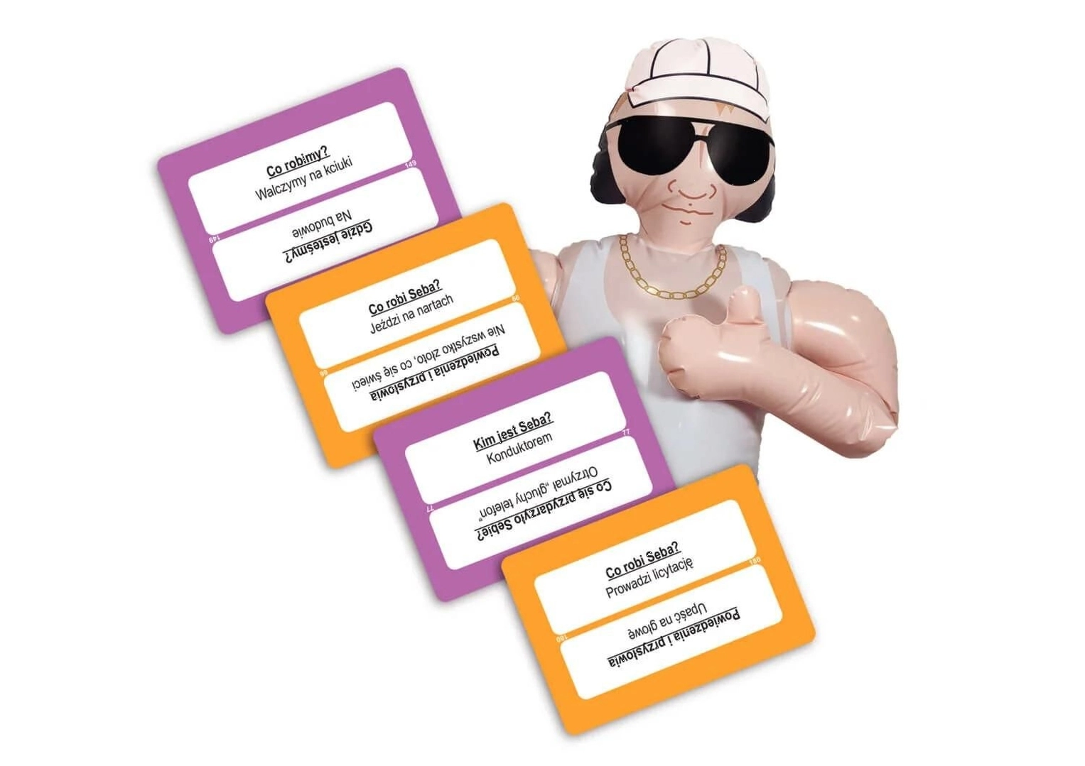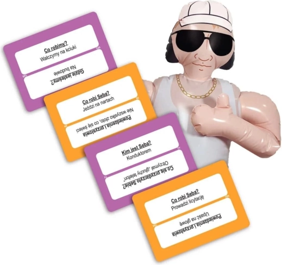Le jeu peut en outre être combiné avec le populaire « Kim jest Janusz? » pour créer un défi en équipes entre les équipes de Seba et de Janusz. Vous obtenez ainsi encore plus de cartes, de variété et d’innombrables situations amusantes.