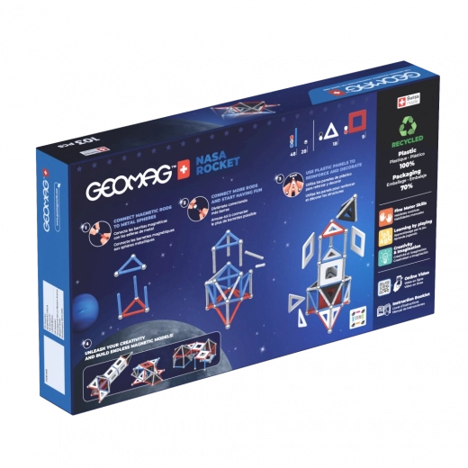 Découvrez l’édition limitée GEOMAG en collaboration avec la NASA et construisez votre propre fusée spatiale, module lunaire et d’autres modèles 3D. Le set de 103 pièces utilise des tiges magnétiques et billes métalliques pour des structures stables, développe la créativité, la représentation spatiale et les compétences STEM. Fabriqué en Suisse, adapté à partir de 3 ans.