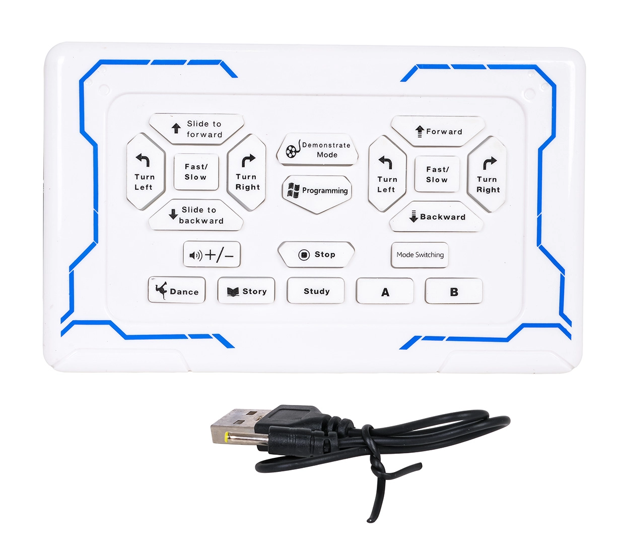 - marche avant/arrière, virage droite/gauche, mouvement des bras, danse, mélodies, narration d’histoires, questions et réponses, mode démo