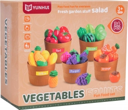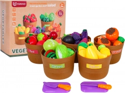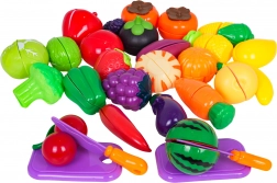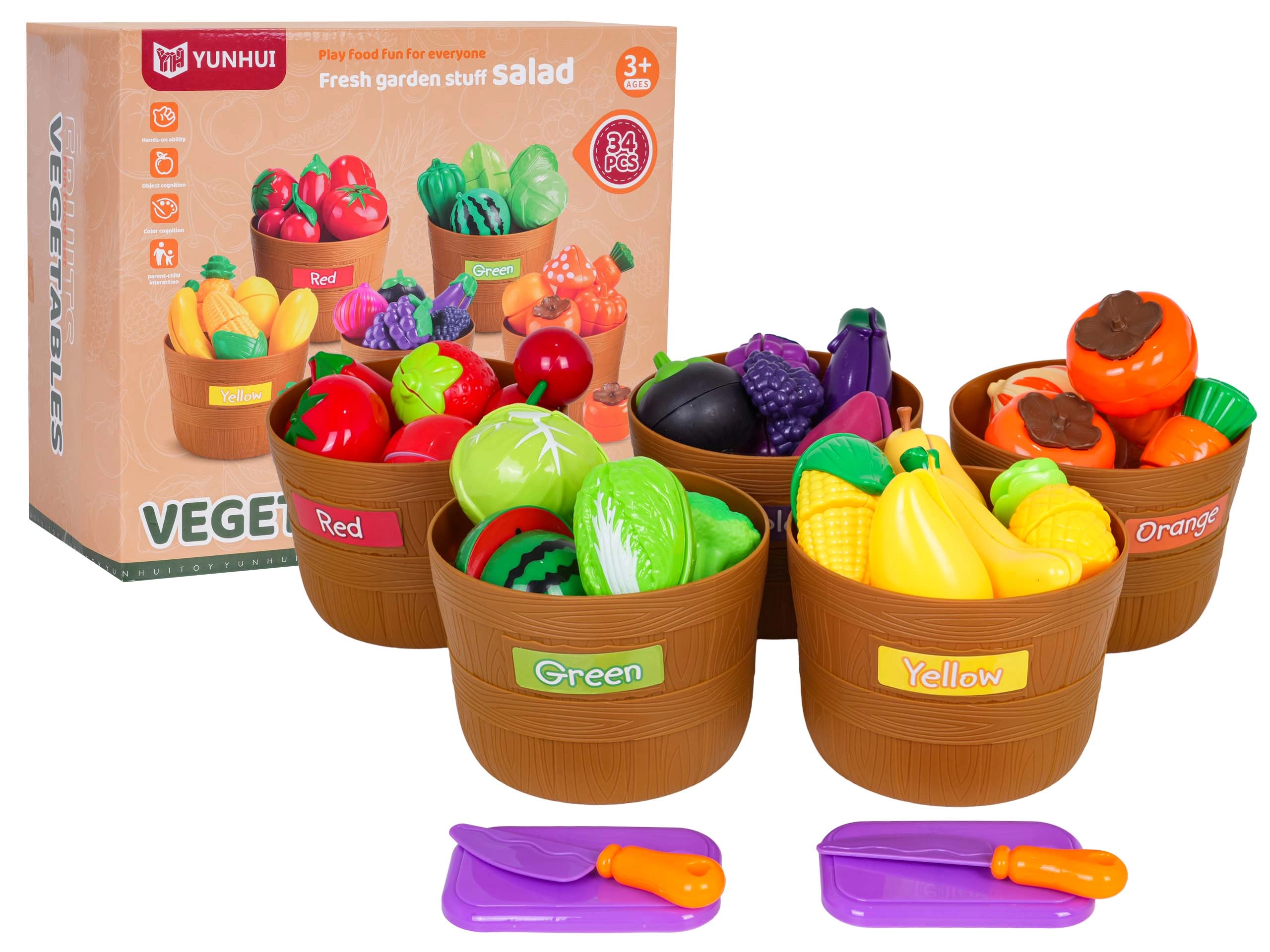Deux couteaux, deux planches et des paniers résistants composent un ensemble complet qui stimule le jeu créatif, la motricité et la connaissance des aliments.
