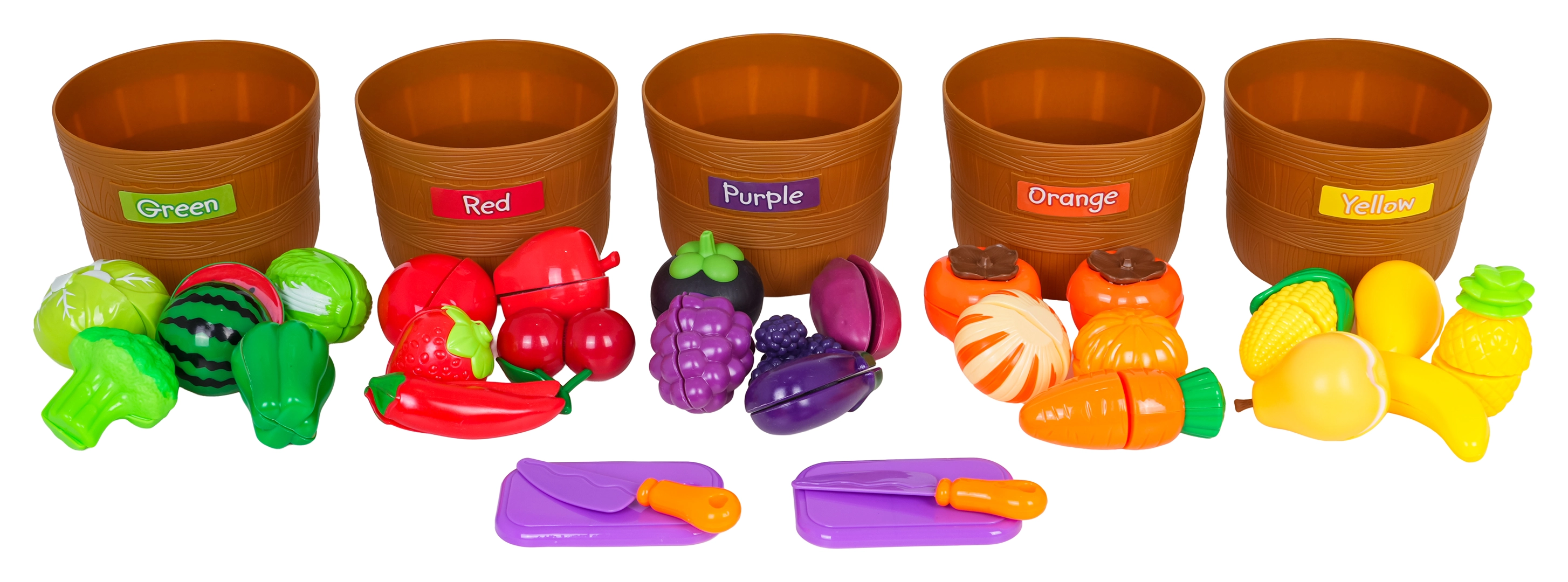 Cinq paniers identifiés (vert, rouge, violet, orange, jaune) aident les enfants à trier facilement les fruits et légumes par couleur et développent la pensée logique.