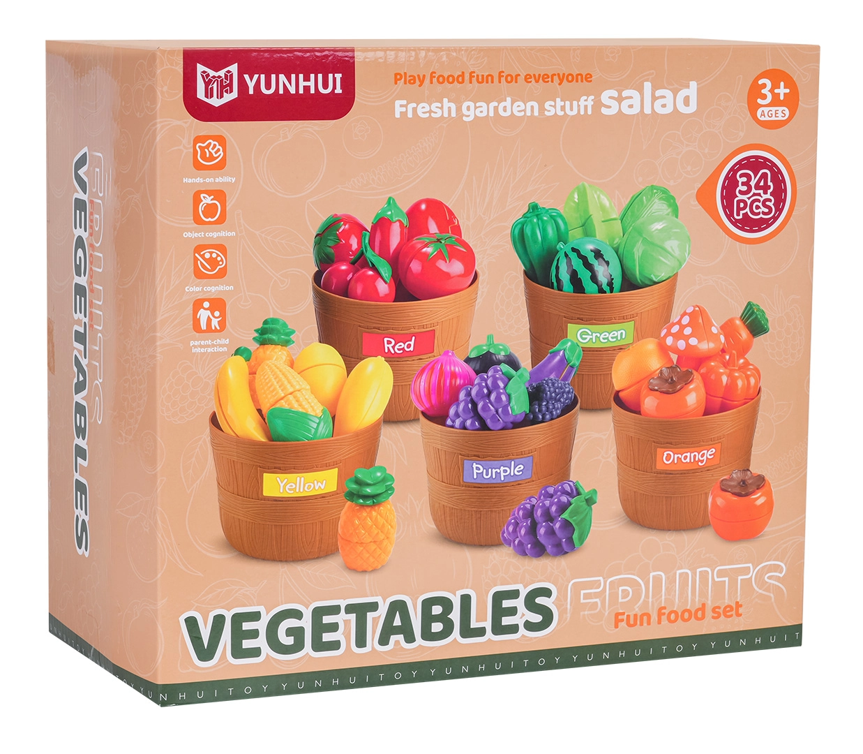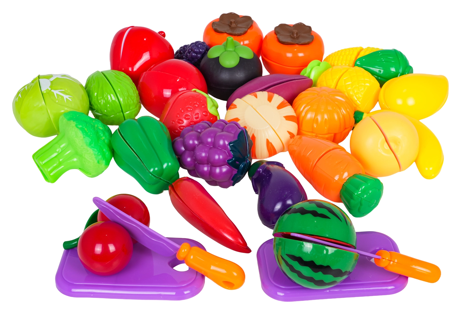 De nombreux fruits sont reliés par velcro – les enfants peuvent les « découper » à plusieurs reprises avec les couteaux en plastique fournis, sur les planches, sans risque de blessure.