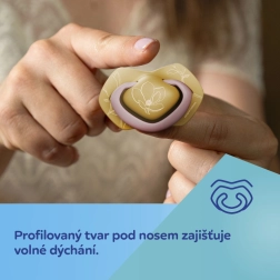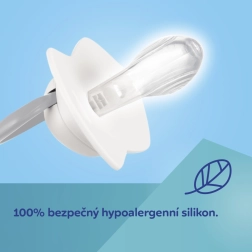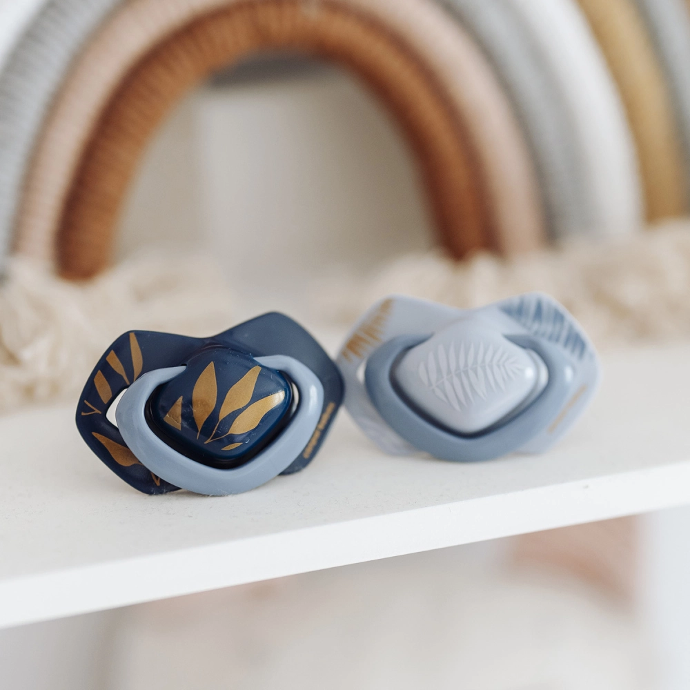 La tétine symétrique s’adapte naturellement à la bouche quelle que soit sa position, soutenant le bon développement de la cavité buccale et une succion confortable.