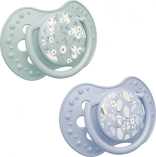 Le bouclier ergonomique et léger avec ouvertures de ventilation préserve les peaux sensibles et facilite une respiration nasale libre. La partie en silicone renforcée résiste mieux aux morsures – particulièrement utile pendant la poussée dentaire. Le anneau/poignée pratique permet une prise en main aisée et la fixation d’un clip. Le paquet comprend 2 tétines et un étui hygiénique.
