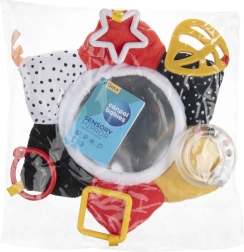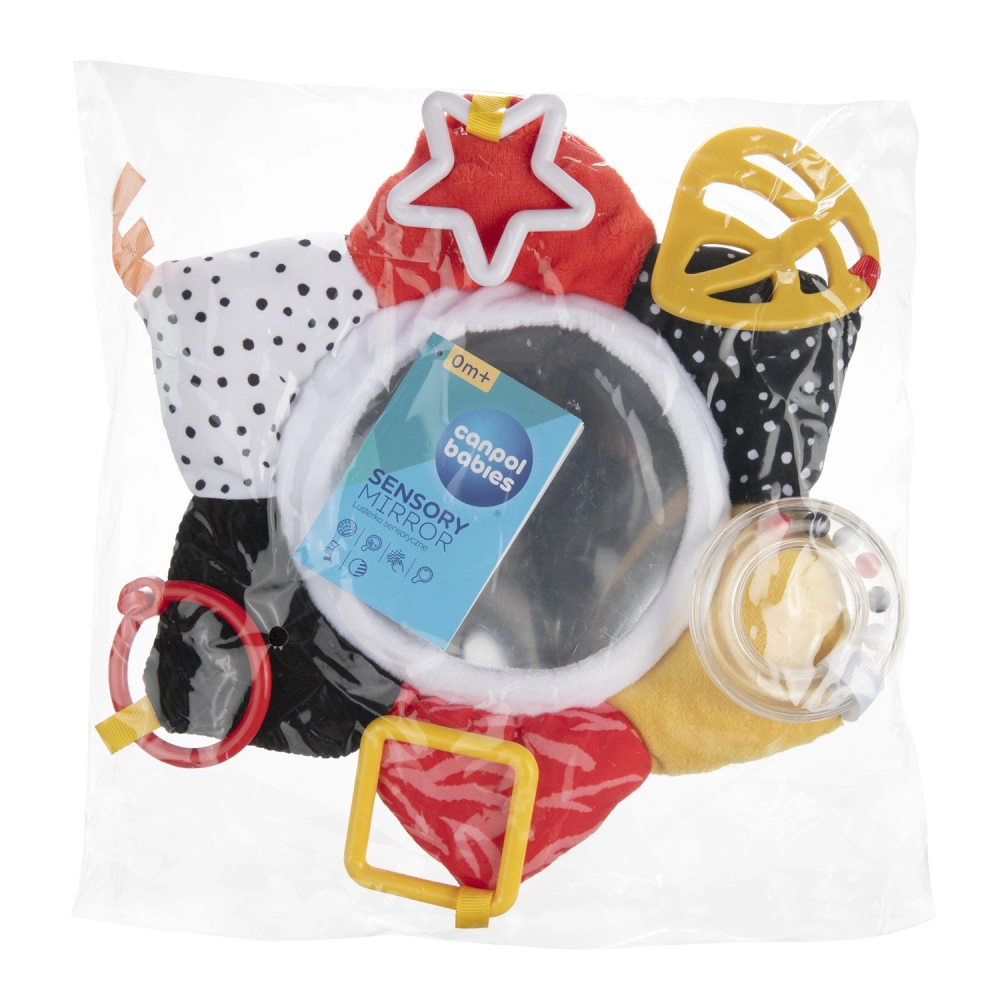 Jouet ludique et évolutif pour les tout-petits : miroir sensomoteur doux CANPOL babies de la collection BabiesBoo avec couleurs contrastées, miroir sécurisé, éléments bruissants, anneau de dentition et hochet. Grâce à l’anneau pratique, vous pouvez l’attacher facilement à la poussette, au lit bébé ou au siège auto et favoriser le développement de la vue, de l’ouïe, du toucher ainsi que de la motricité fine dès 0 m+.