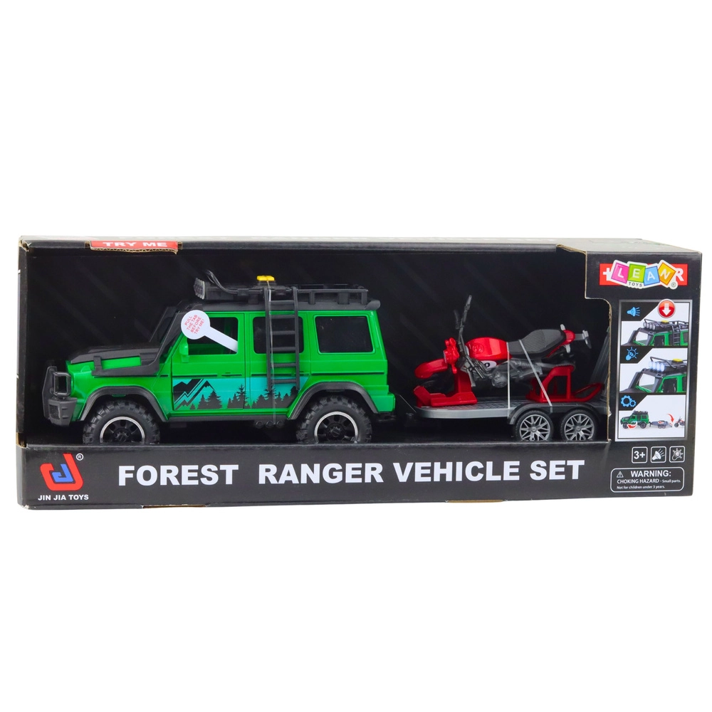 L’ensemble comprend une remorque détachable à deux essieux avec rampe de chargement et une moto richement détaillée. Chaque élément peut être utilisé séparément ou ensemble – la voiture, la remorque et la moto favorisent l’imagination, la coordination et le jeu autonome.