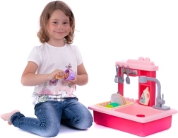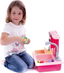 Profitez d'un lavage de vaisselle amusant avec cet évier pour enfants de couleur rose, qui comprend un robinet fonctionnel, un réservoir d'eau et un égouttoir amovible.