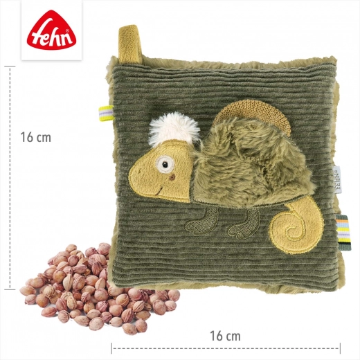 Adorable coussin en peluche en forme de caméléon avec un sachet amovible rempli de noyaux de cerise apportant une douce chaleur ou une agréable fraîcheur pour les bébés dès la naissance. Grâce à la fermeture pratique à scratch, le sachet se retire rapidement pour être réchauffé au four ou refroidi au réfrigérateur ou au congélateur. Idéal pour apaiser, soulager le ventre et offrir du confort dans le lit, le siège auto ou la poussette.