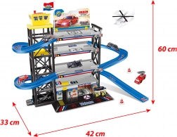 Organise ta flotte de voitures dans un garage clair et pratique sur quatre niveaux avec héliport ! Inclus : 4 étages, une hélicoptère et 3 voitures métalliques de 7–8 cm environ. Une fois assemblé, le garage mesure 42 × 60 × 33 cm et convient aux enfants à partir de 4 ans. Impossible de choisir des modèles précis. Avertissement : produit livré dans un emballage de remplacement.
