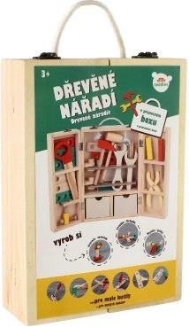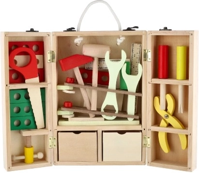 Découvrez une mallette à outils en bois de qualité qui permet aux enfants d’imiter en toute sécurité le monde des adultes. Le set comprend des tournevis, un marteau, des clés, des écrous, des vis, une équerre, une règle, une scie et d’autres accessoires. Le tout est rangé de manière claire dans une mallette solide avec poignée pour un transport facile.