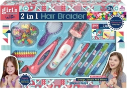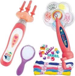 La boîte contient tout pour créer immédiatement : un enfileur pour un travail rapide, différentes perles pour des combinaisons variées, un peigne pour la mise en forme, des fils de coton et des élastiques pour la fixation, et un tresseur fonctionnant avec 2 piles AA. Convient aux enfants à partir de 3 ans.