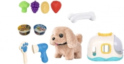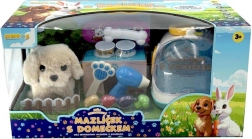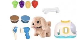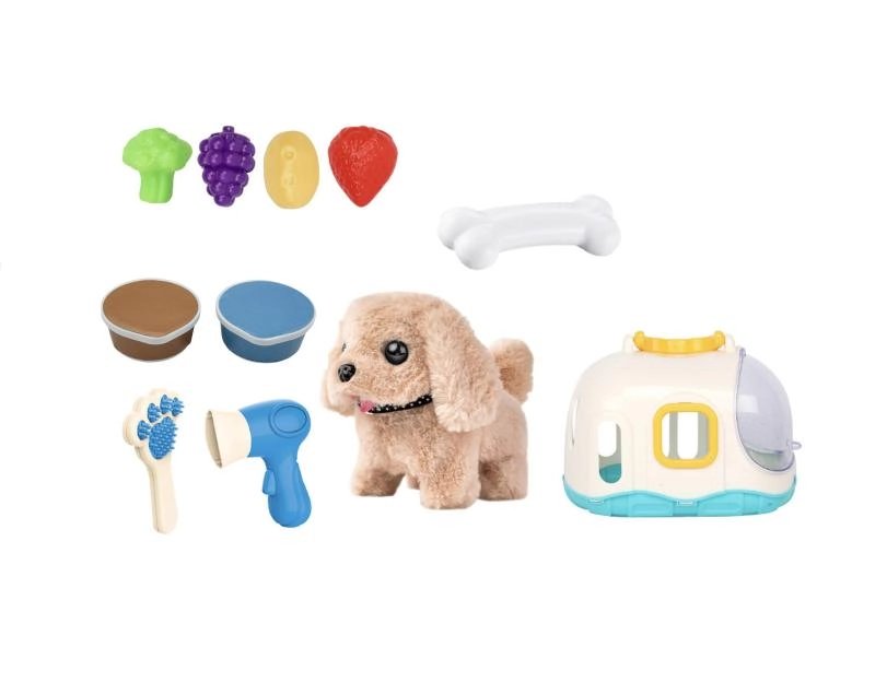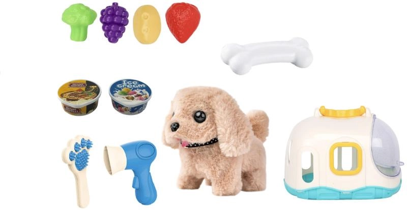 La maison pratique sert à la fois de refuge douillet et de mallette de transport, pour emporter le petit chien partout. La boîte contient aussi des accessoires de soin — un peigne et un sèche-cheveux — ainsi que des friandises en plastique en forme de fruits et légumes pour jouer à le nourrir.
