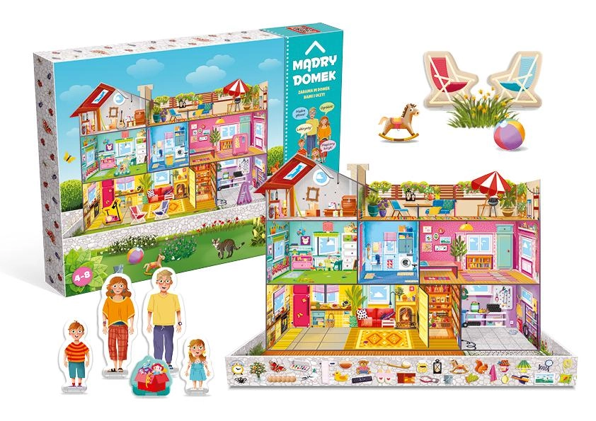 Le jeu éducatif Granna Domek 3D associe construction créative et large palette de tâches. Les enfants bâtissent une maison en trois dimensions, y placent 27 éléments de mobilier et, en jouant, enrichissent leur vocabulaire, leur logique et leur motricité fine. Les activités sont conçues pour être amusantes, claires et motivantes pour les enfants de 4 à 8 ans.
