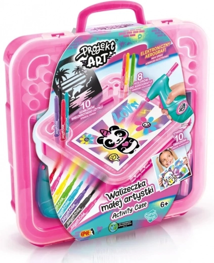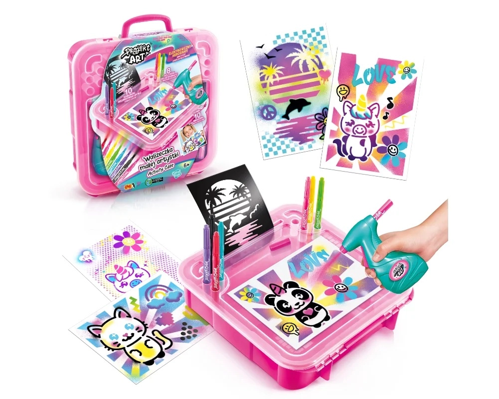 Le set Epee Projekt Art – valisette de petite artiste offre aux enfants une façon ludique de découvrir l’art. Il suffit de placer un pochoir, de pulvériser la couleur avec l’aérographe électronique et d’observer la naissance de belles formes et motifs. Une fois le motif de base terminé, les enfants peuvent ajouter leurs propres dessins et créer une œuvre originale.