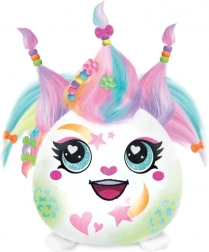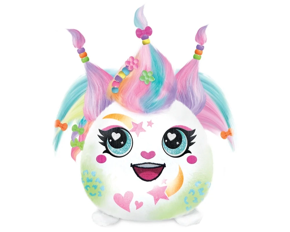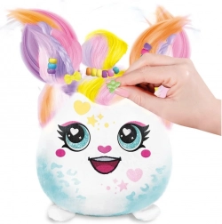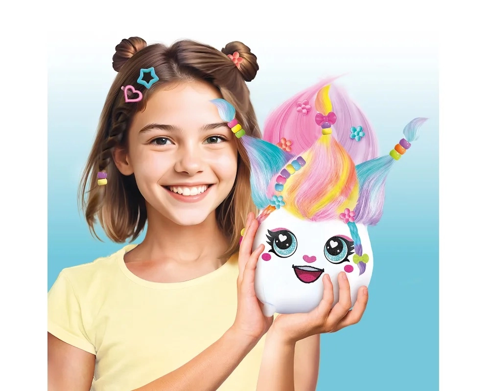 Pinces, élastiques, perles et peigne encouragent la création de tresses, de vagues et de détails décoratifs. Le coiffage est ludique, et la peluche douce invite aux câlins.