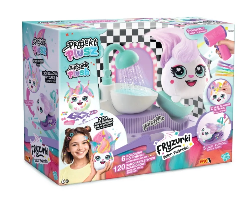 Le kit créatif Epee Projekt Plusz Fryzurki – Salon de beauté apporte aux enfants tout le nécessaire pour décorer et coiffer leur peluche. À l’aide de l’aérographe électronique en forme de sèche‑cheveux et des pochoirs, ils appliquent facilement des motifs colorés, qui peuvent être entièrement modifiés après lavage pour créer encore et encore.