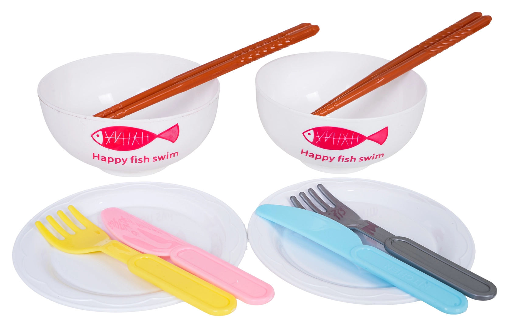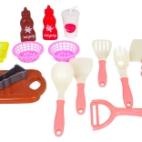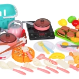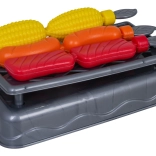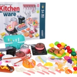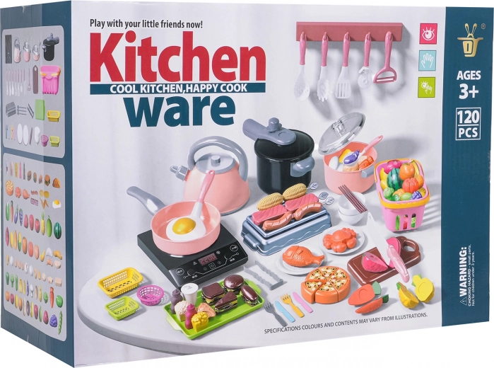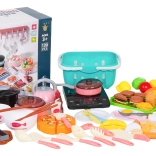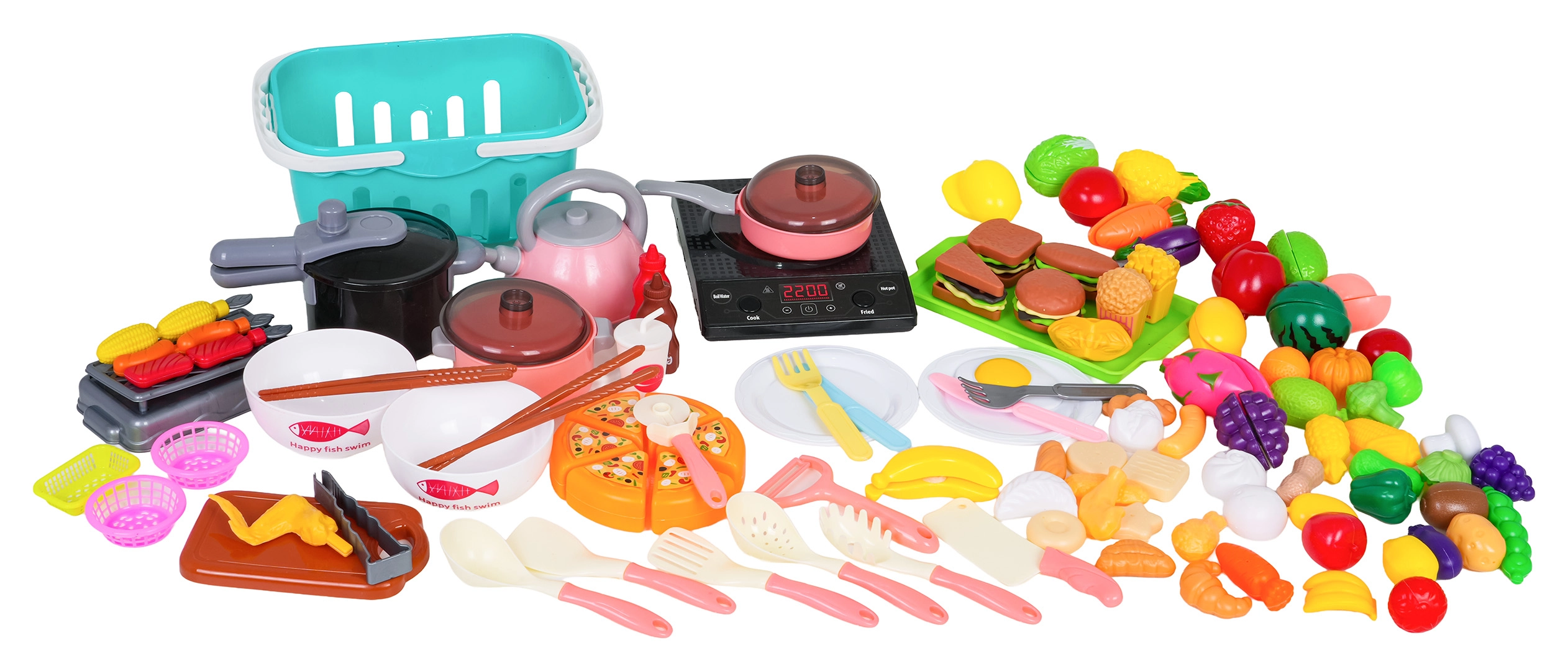 Il comprend une plaque à induction fonctionnant avec 3× AA (non incluses), affichant la température et dotée de commandes tactiles ; un grill, un ensemble de vaisselle (bouilloire jouet, autocuiseur, poêle, casserole), des sets de service (bols, assiettes, couverts, baguettes), des aliments à découper à scratch, une pizza avec roulette, des brochettes et bien plus encore. Le tout est complété par un panier de courses et un plateau de service pour un jeu réaliste.