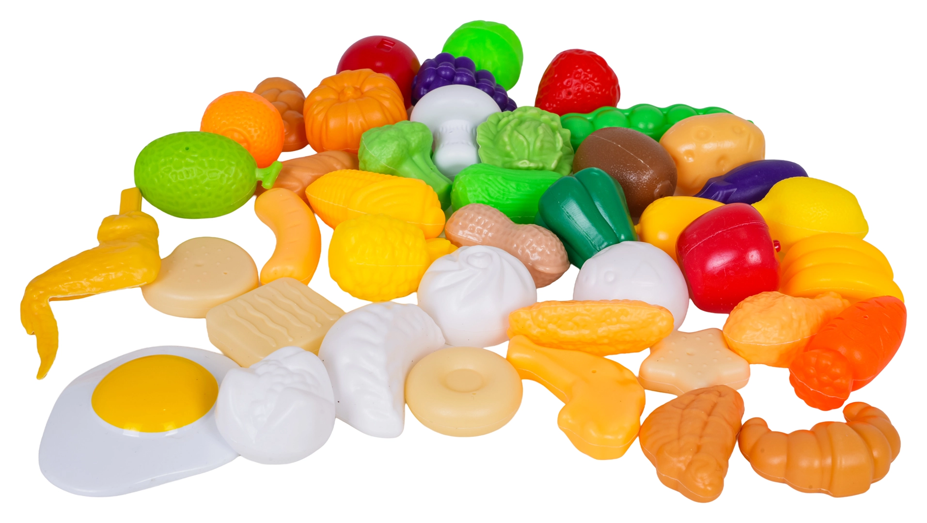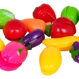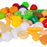 Un grand panier de courses et un assortiment coloré de fruits et légumes, dont des pièces à scratch, aident à reconnaître les aliments et entraînent la motricité fine lors de la découpe.