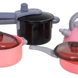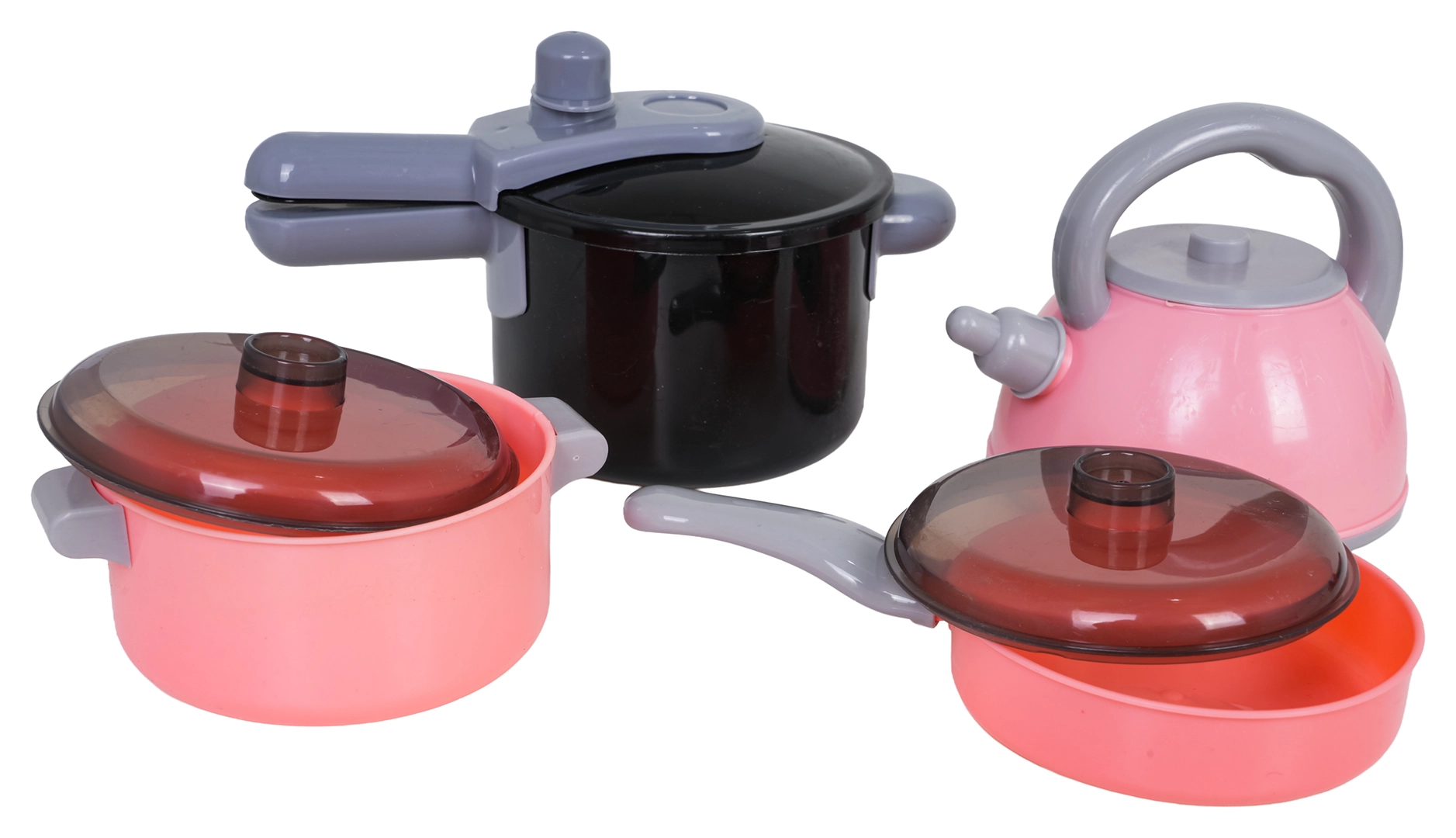 Casserole, poêle avec couvercle, autocuiseur et bouilloire sont complétés par un grill compact. Les enfants peuvent cuire, mijoter et griller leurs « plats » préférés.