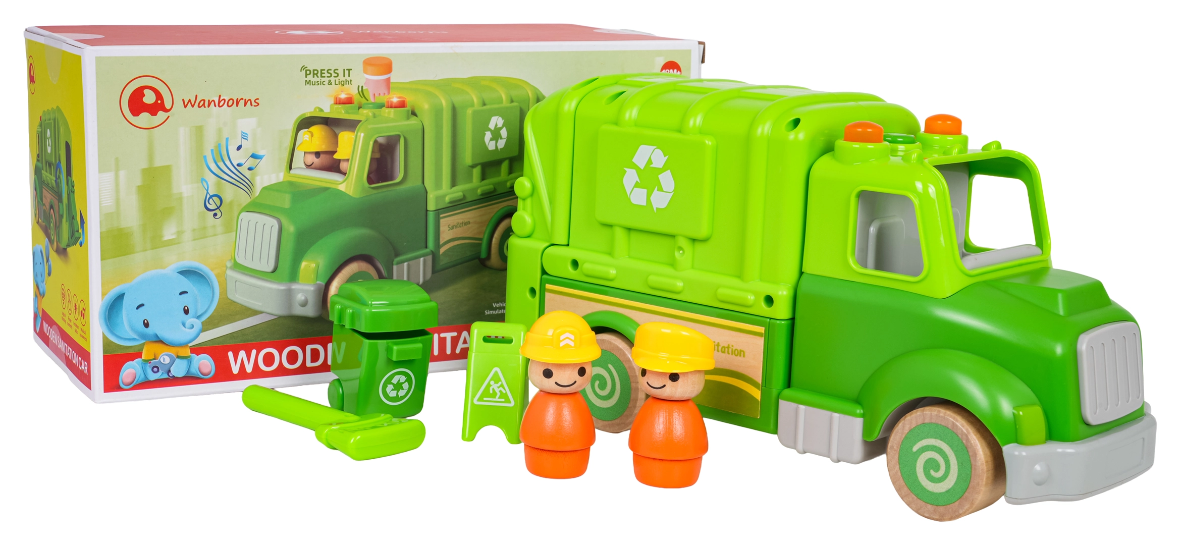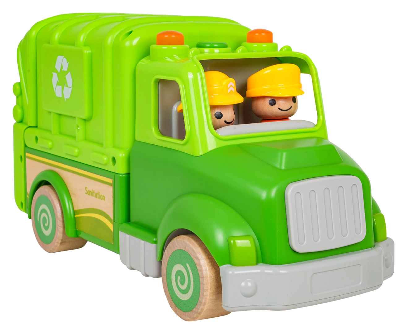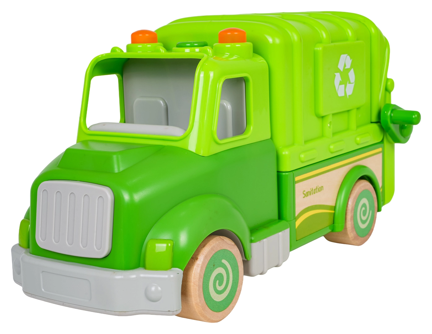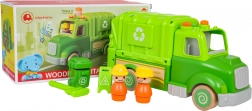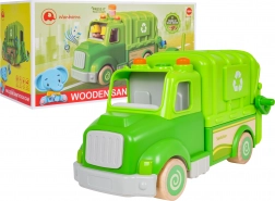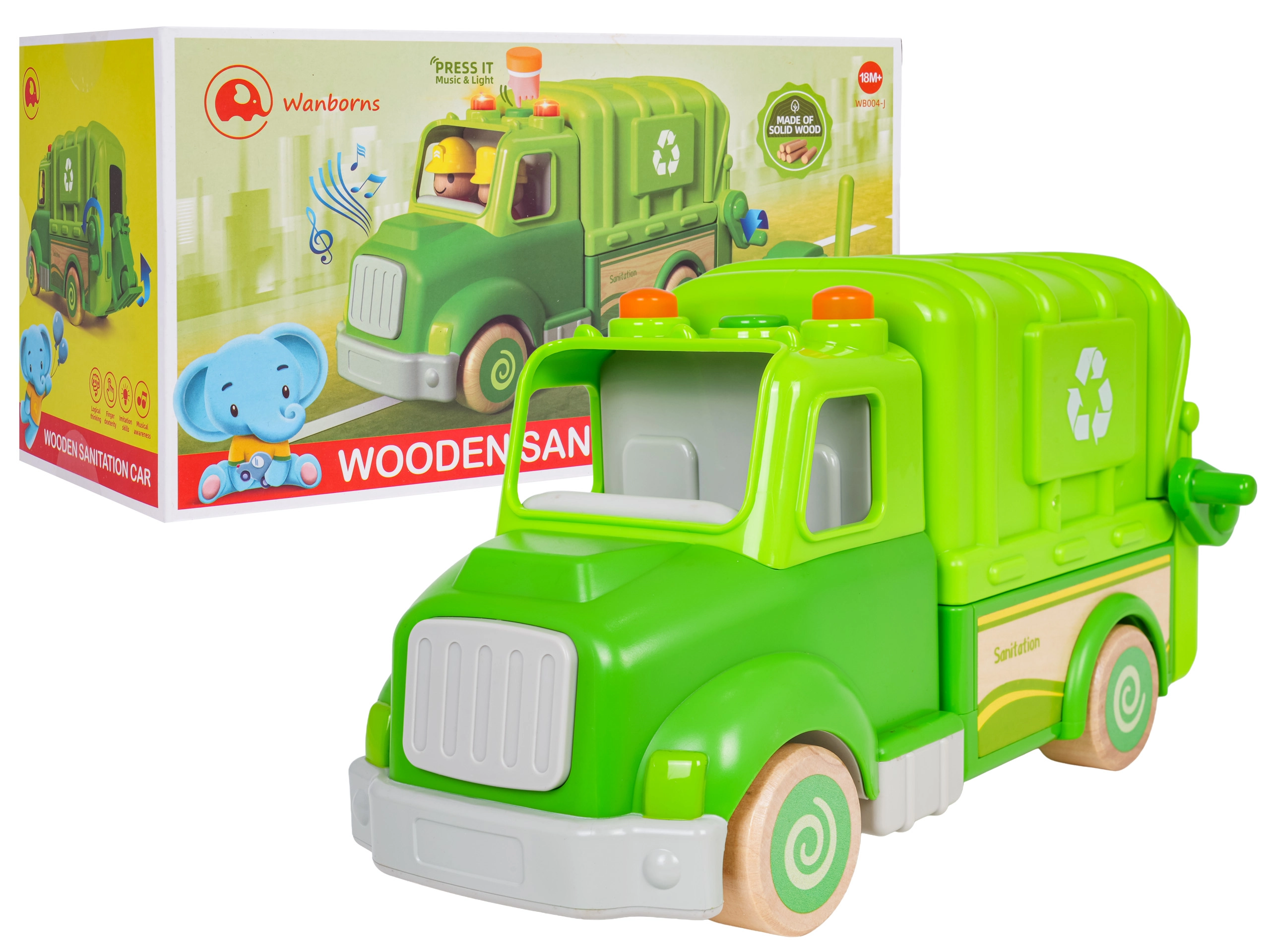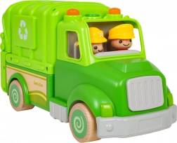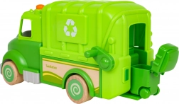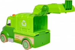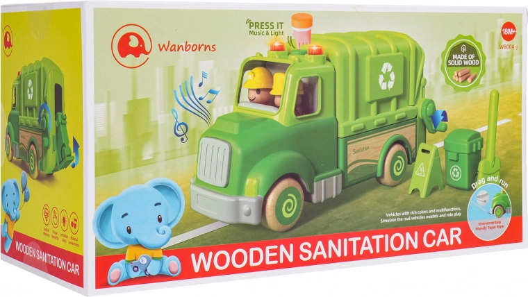 Ce camion poubelle vert est conçu pour un jeu sûr et créatif. Des formes arrondies, des roues en bois et une structure solide en bois et plastique en font un jouet idéal pour les enfants. Sur le toit, un bouton déclenche des mélodies, sons de conduite, de démarrage et de klaxon, accompagnés de petites lumières clignotantes.