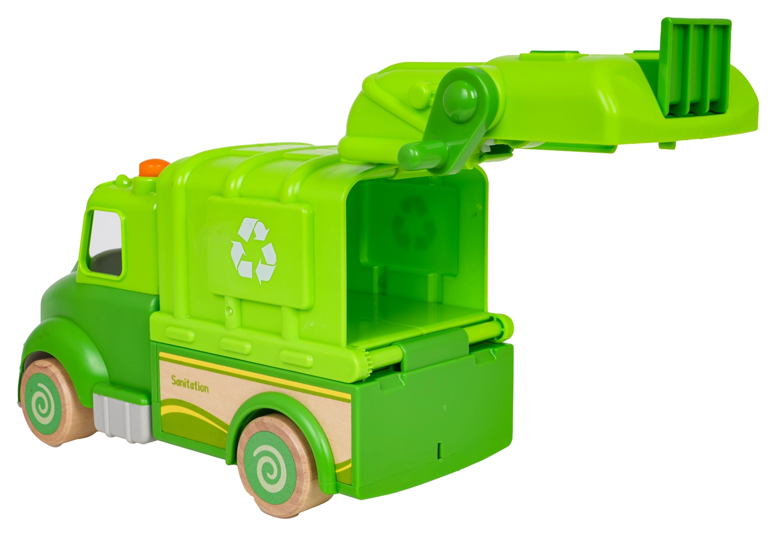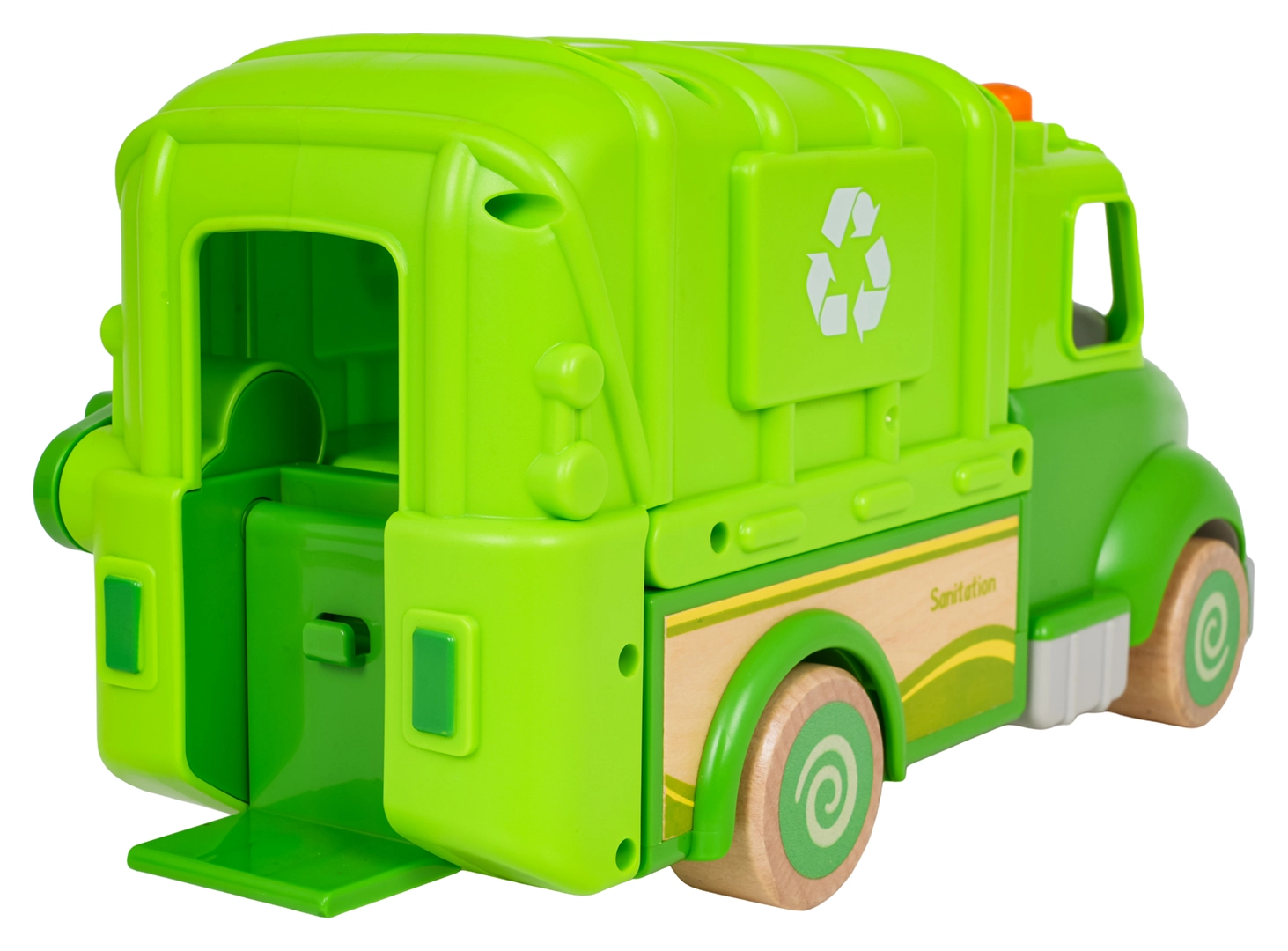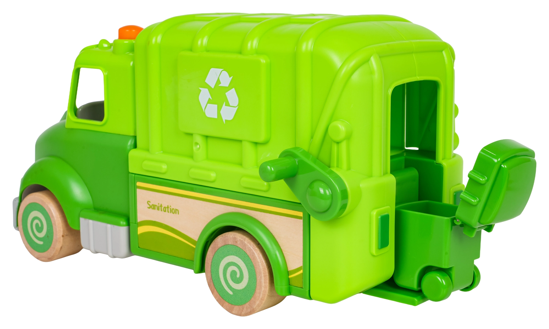 Soulevez la poubelle, ouvrez l’arrière et videz les « déchets » comme de vrais éboueurs. Amusement et apprentissage du tri réunis.