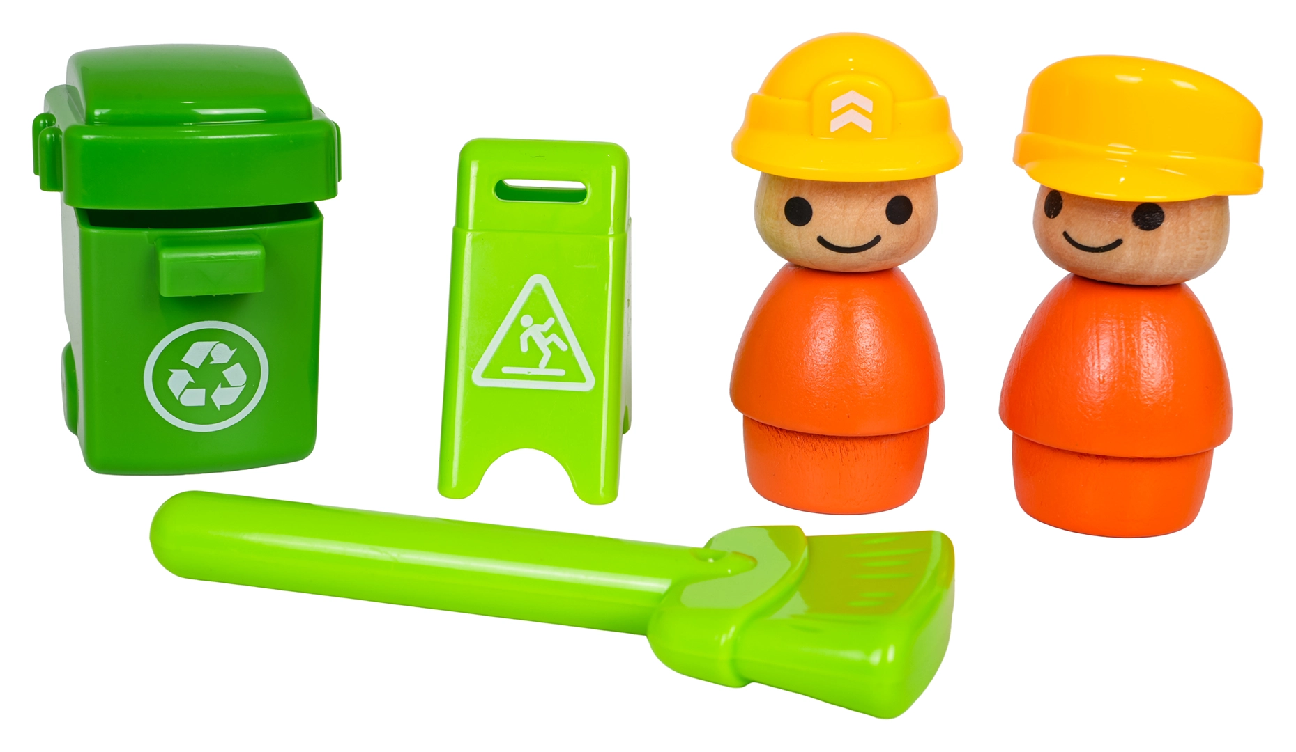Sont inclus 2 figurines, une poubelle, un panneau de signalisation et un balai. Le tout dans une conception sûre aux couleurs vives.