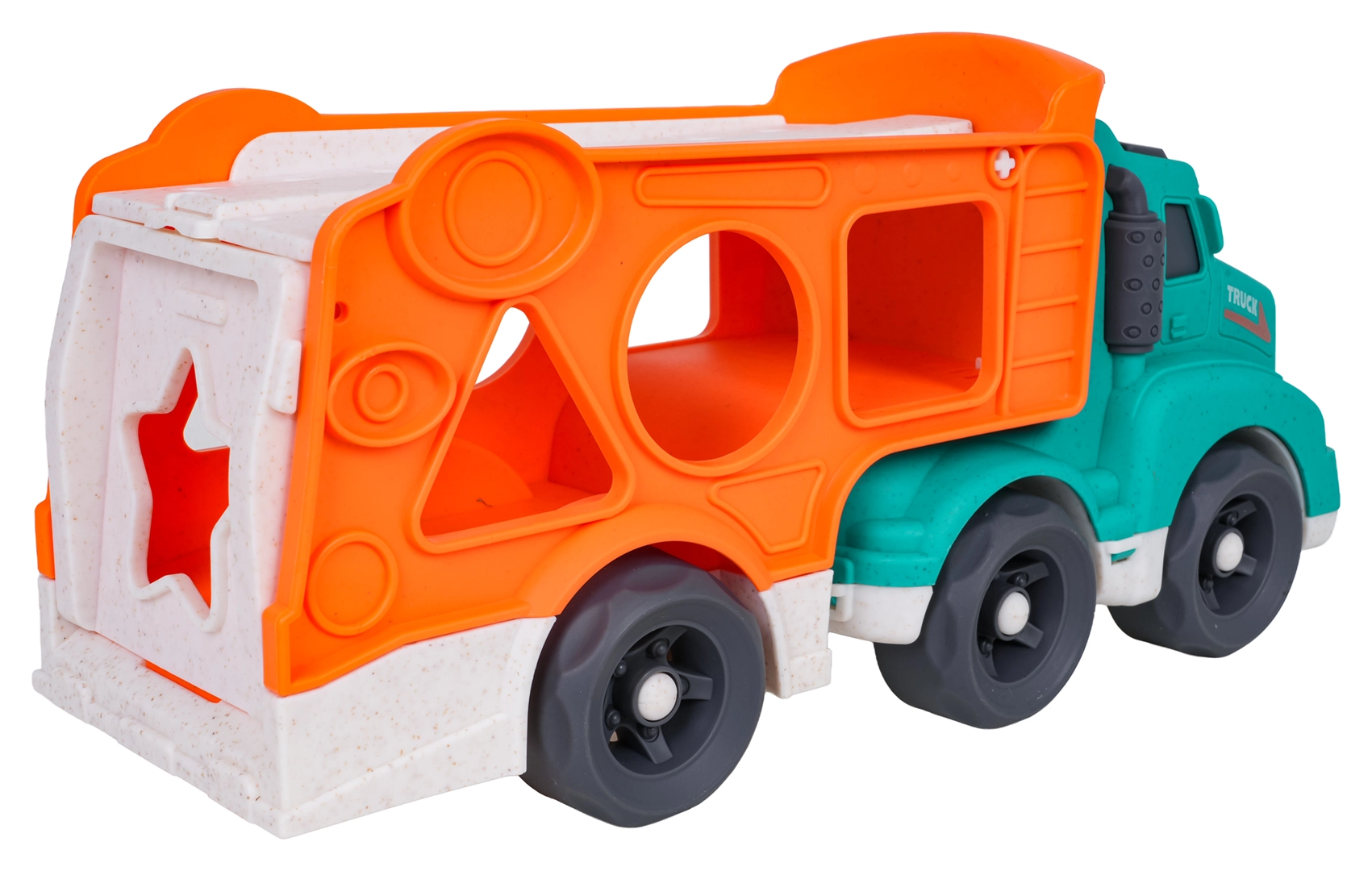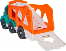 Coloré, le camion de remorquage en bioplastique combine un transporteur de voitures et un trieur de formes en un seul jouet. Il comprend 2 petites voitures et 4 formes, possède des roues mobiles, une construction robuste et une partie remorque détachable. Convient aux enfants à partir de 18 mois, sûr et écologique – idéal à la maison comme en extérieur.