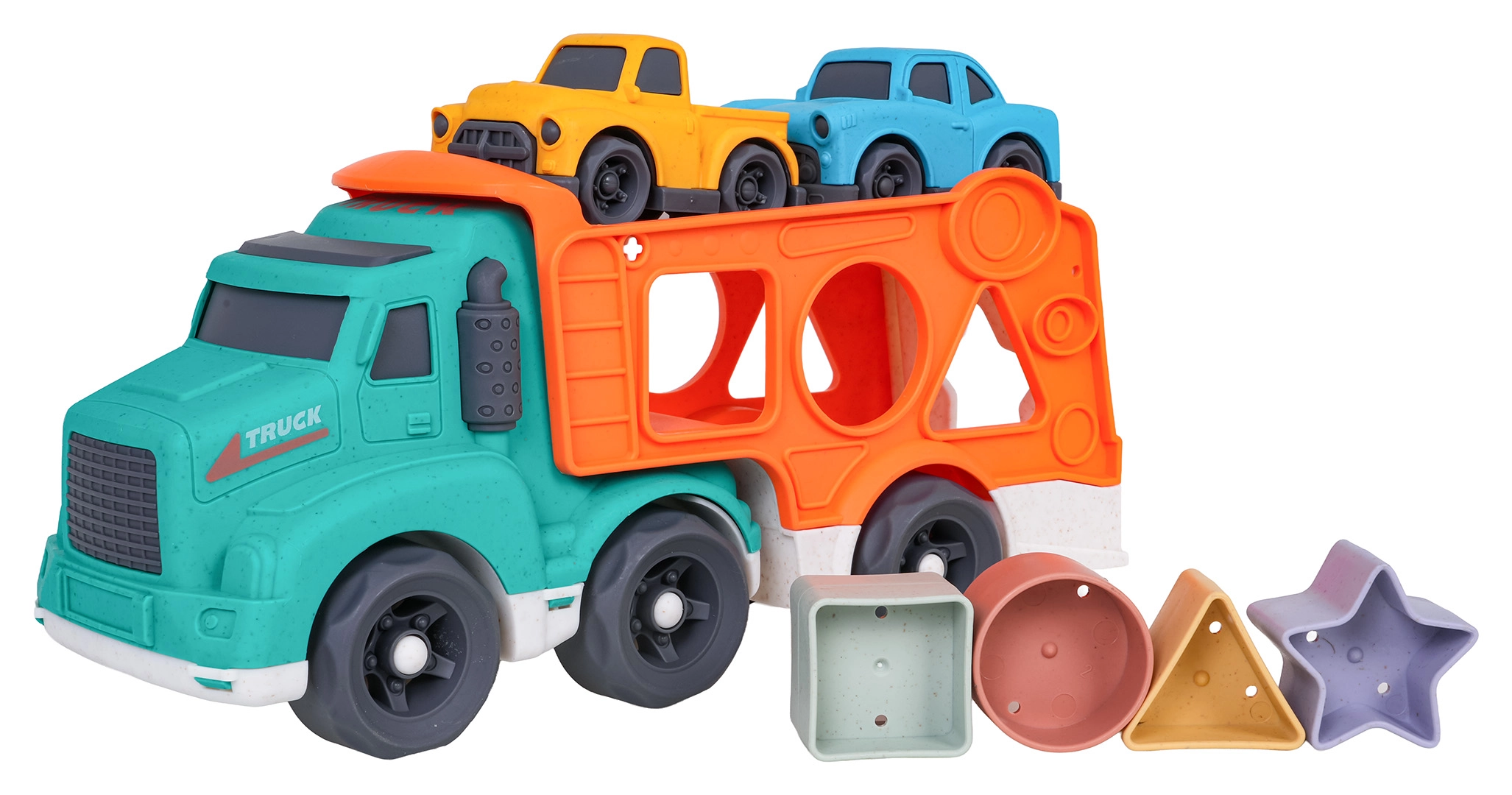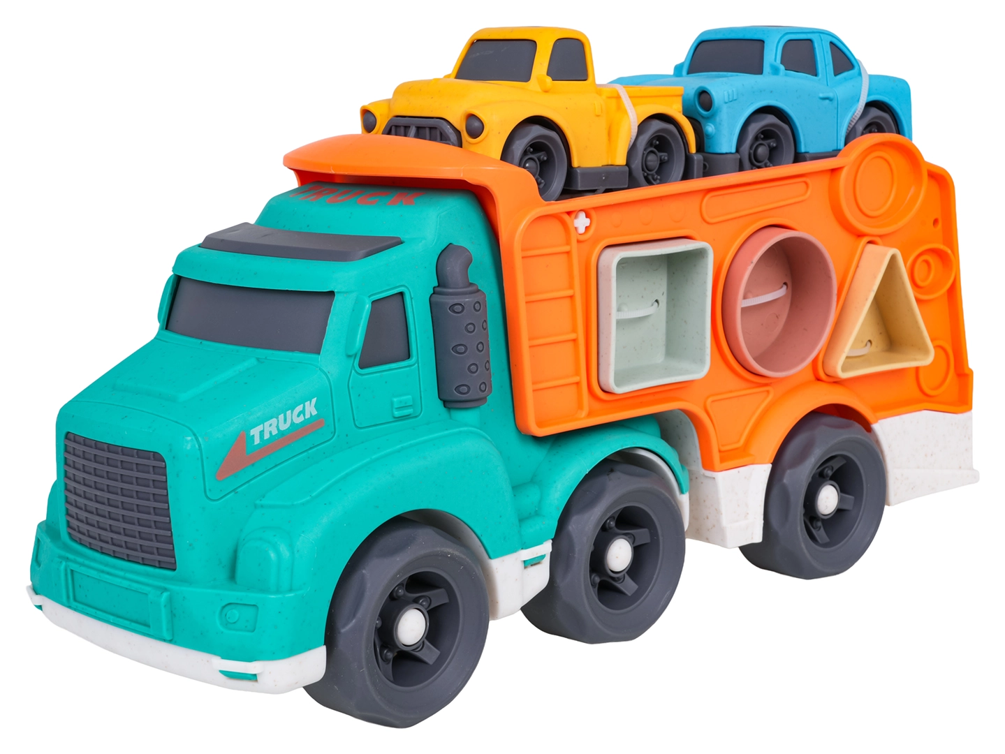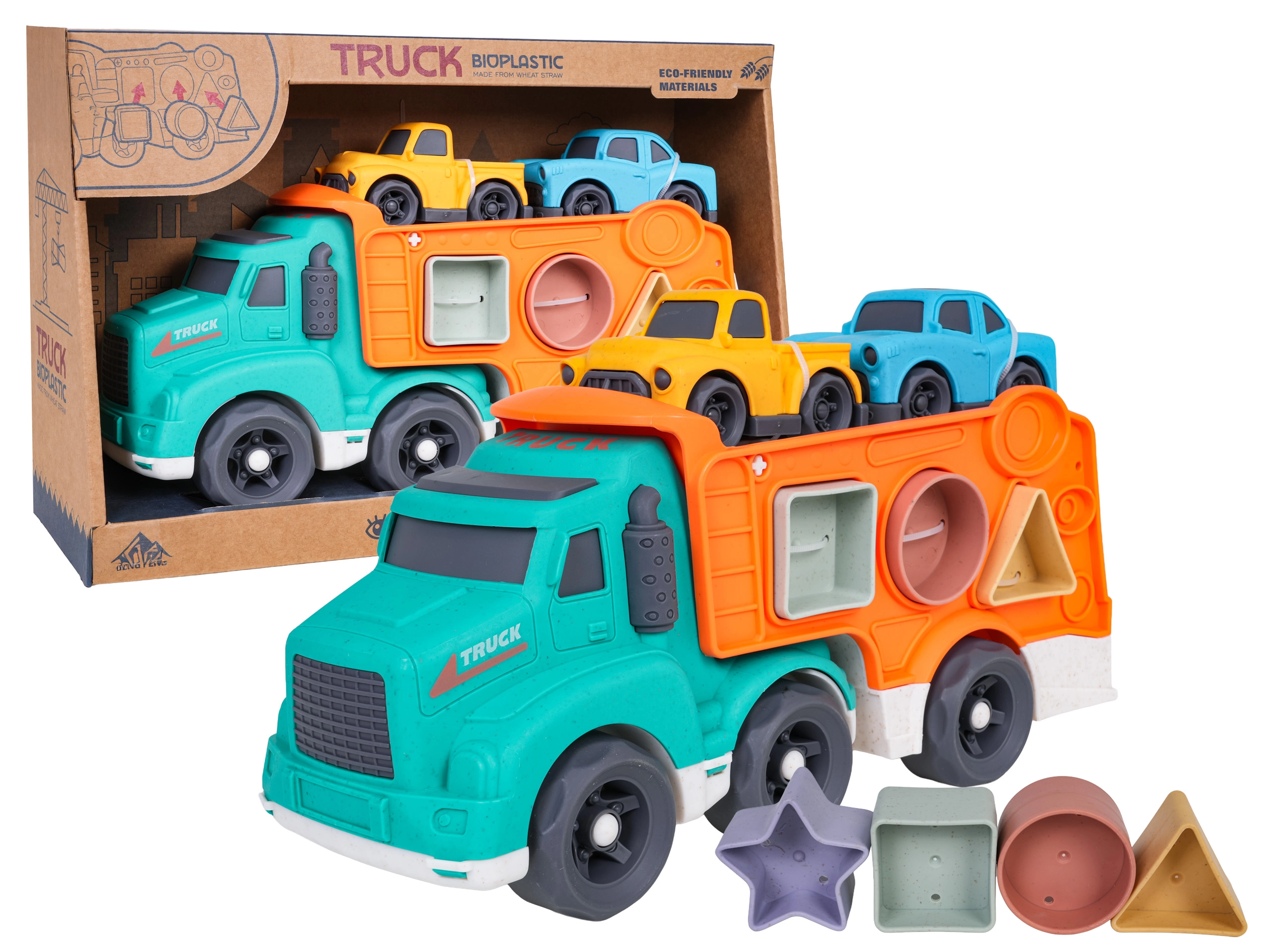 Ce jouet écoresponsable allie plaisir et apprentissage : les enfants développent leur motricité fine et la reconnaissance des formes grâce au trieur situé sur les côtés du transporteur, tout en profitant de trajets imaginatifs avec les deux petites voitures. Le bioplastique résistant, les formes arrondies et les couleurs vives garantissent un jeu sûr et attrayant.
