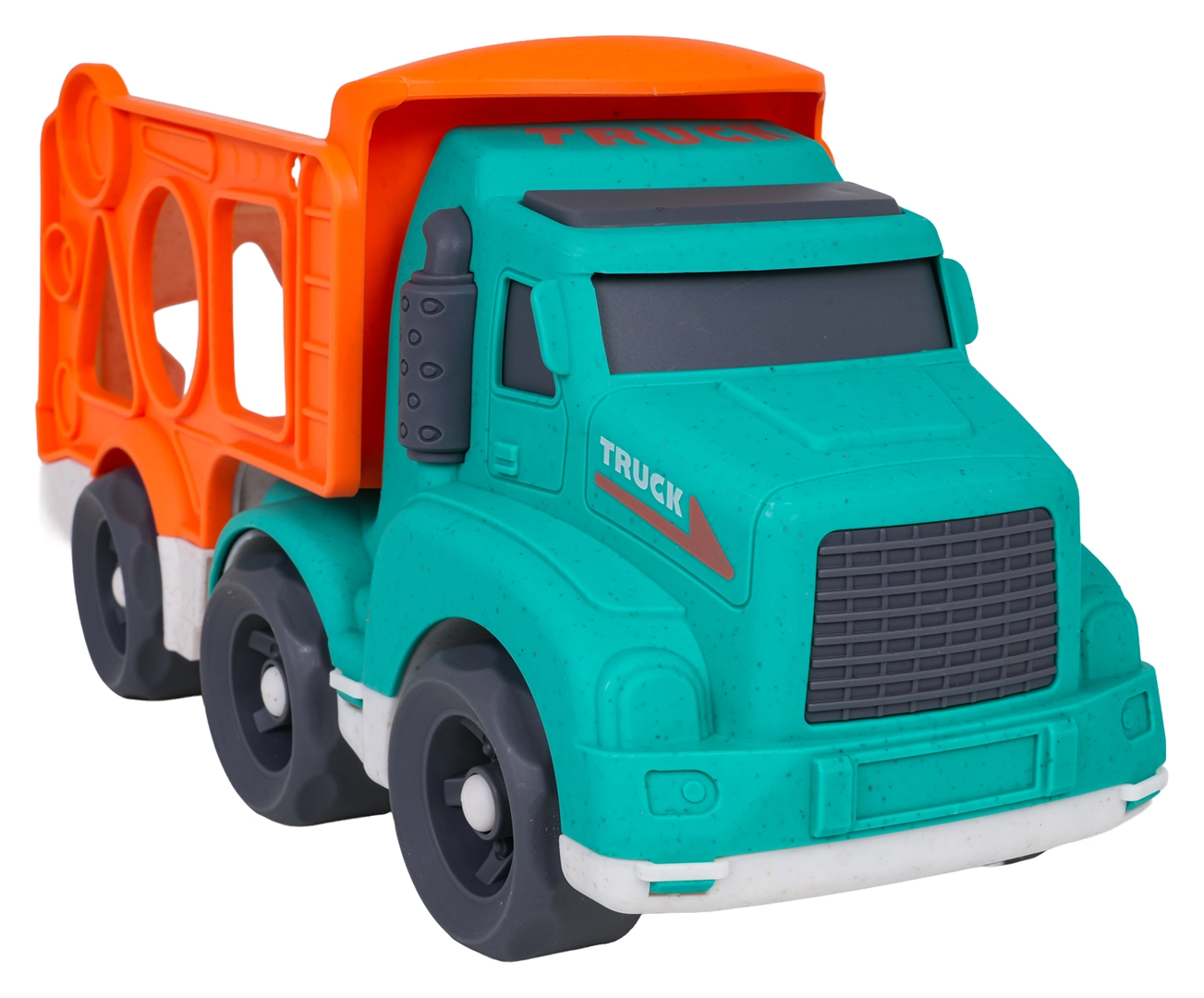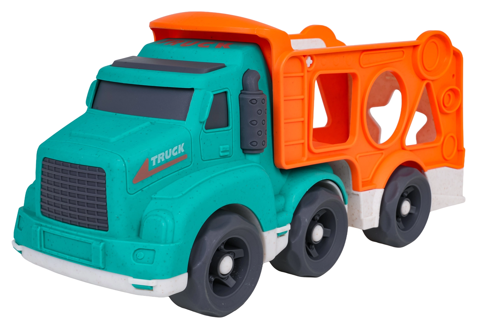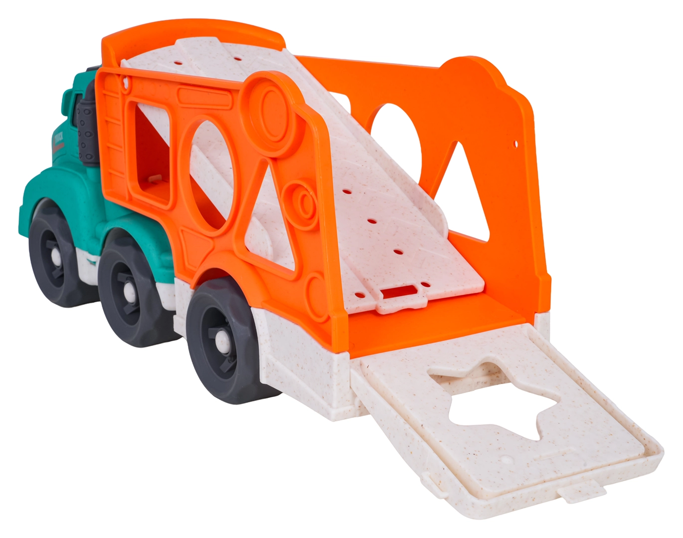 Ce jouet écoresponsable allie plaisir et apprentissage : les enfants développent leur motricité fine et la reconnaissance des formes grâce au trieur situé sur les côtés du transporteur, tout en profitant de trajets imaginatifs avec les deux petites voitures. Le bioplastique résistant, les formes arrondies et les couleurs vives garantissent un jeu sûr et attrayant.