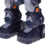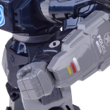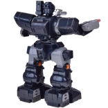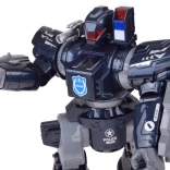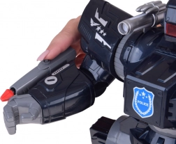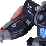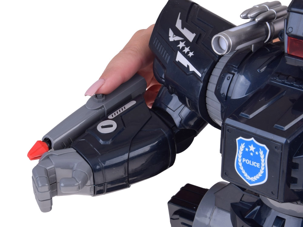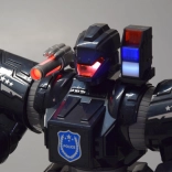 Jambes massives et pieds larges pour une marche stable, marquages POLICE, insignes et barre lumineuse d’épaule. Les bras articulés permettent des poses dynamiques.