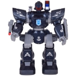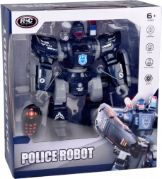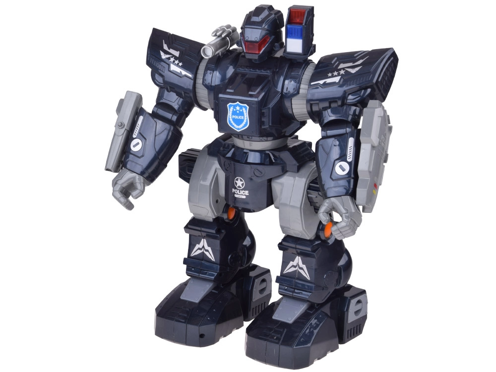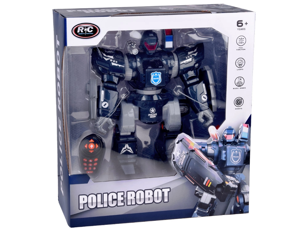 Mettez en service un gardien futuriste de l’ordre. Le robot policier RC en bleu marine et gris avec emblèmes POLICE séduit par sa construction robuste, ses bras articulés et son équipement d’épaule. La commande est intuitive grâce à une télécommande claire – le robot avance/recul, pivote et danse avec effets lumineux et musique.