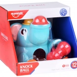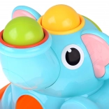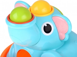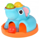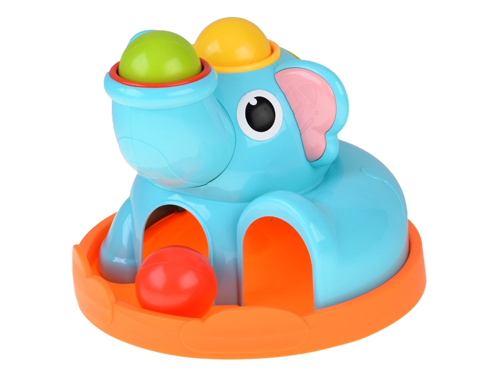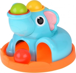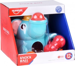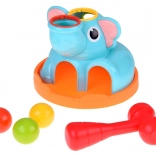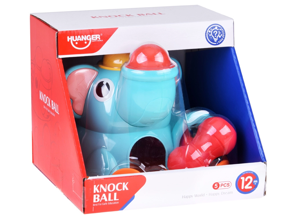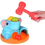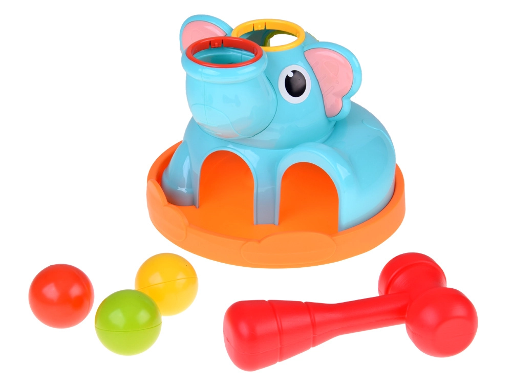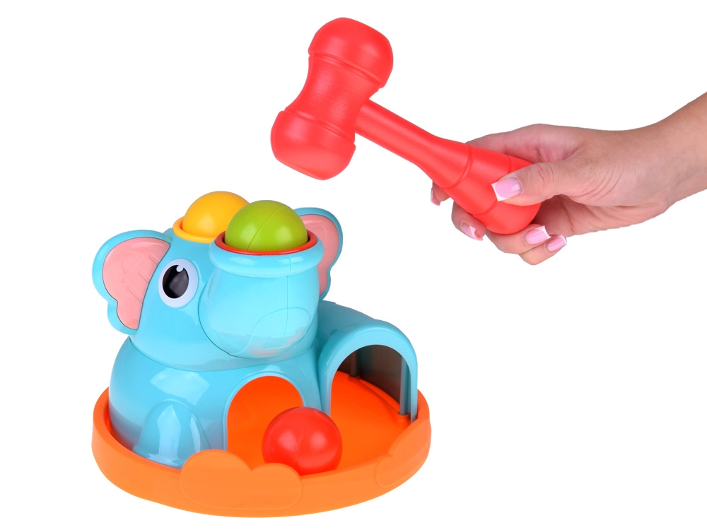 Le mignon éléphant sur une base stable attire les enfants par ses couleurs vives et ses formes arrondies. Sont inclus un maillet rouge et trois billes colorées (rouge, jaune, vert) à insérer et marteler dans les ouvertures – les billes traversent ensuite le jouet et ressortent, ce qui motive à recommencer et favorise l’apprentissage de la relation cause–effet.