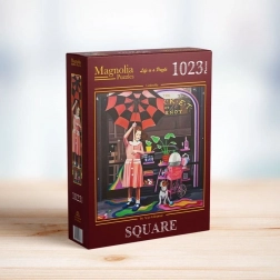 Puzzle élégant avec motif de magnolia et parapluie, comprenant 1023 pièces pour un assemblage relaxant. Une fois terminé, il forme une image carrée de 60 × 60 cm, idéale à encadrer et pour une décoration intérieure élégante.