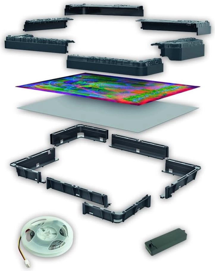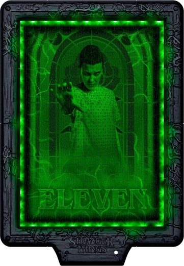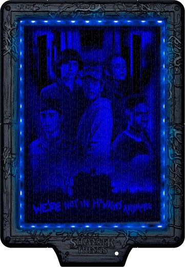 Ce puzzle exceptionnel apporte l’ambiance cinématographique de la série STRANGER THINGS chez vous. Grâce au module électronique intégré et au ruban LED RVB, l’image se transforme lorsqu’il s’allume – chaque couleur de LED dévoile une couche différente de la scène de la Chasse au Démogorgon. À la lumière ambiante, vous voyez une composition avec superposition de trois niveaux colorés ; dans l’obscurité, chaque teinte révèle un nouveau détail.