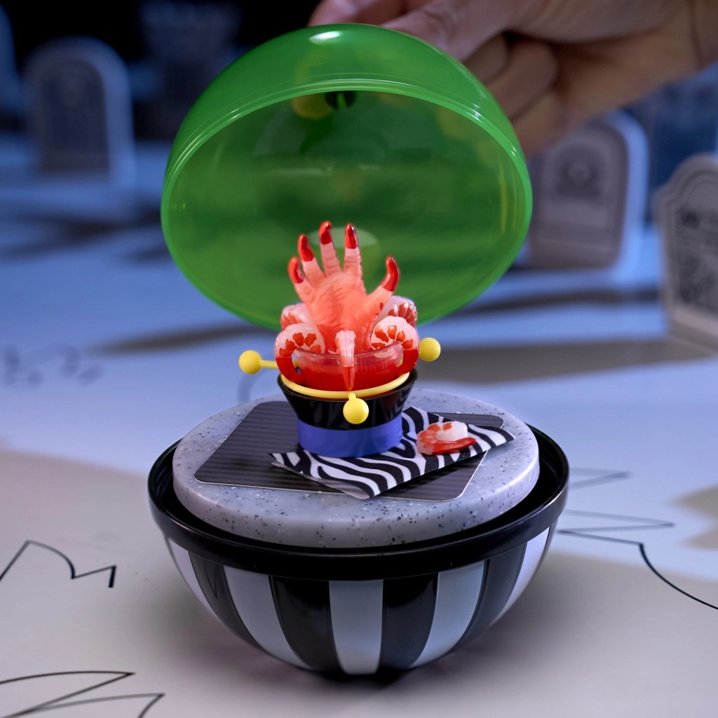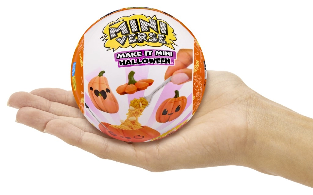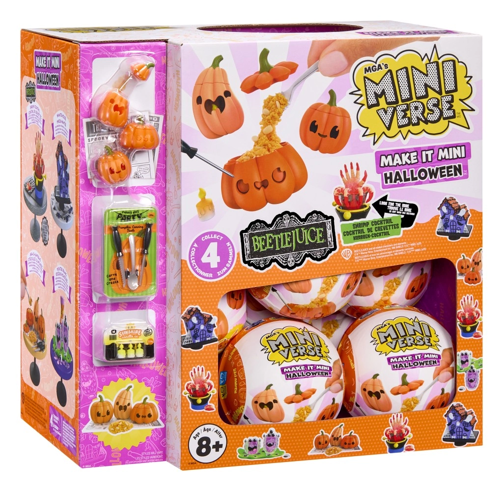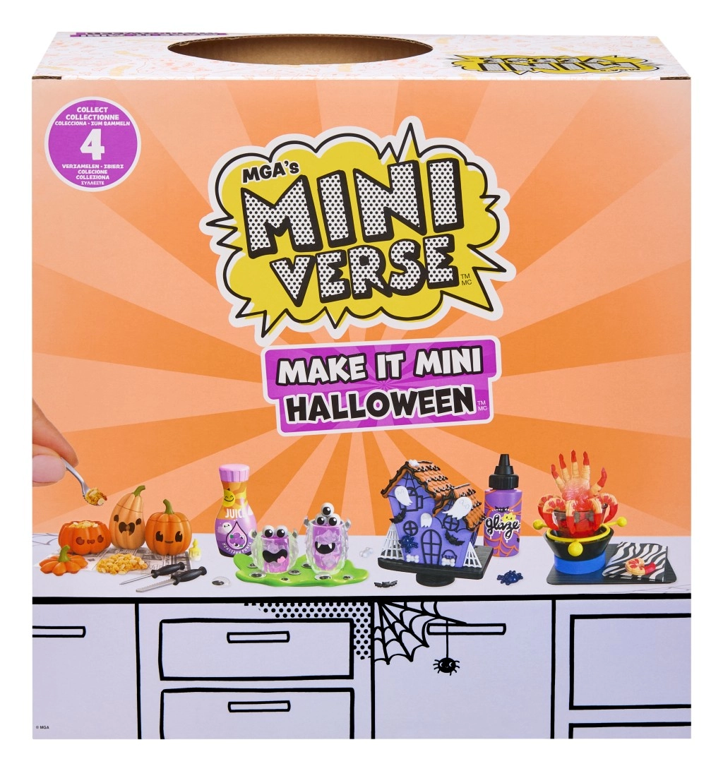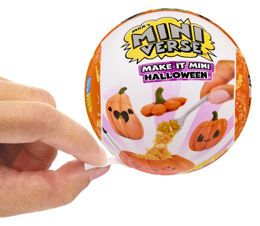 Chaque capsule ronde MINI VERSE est scellée, tu ne sais donc jamais quel set effrayant tu obtiendras – citrouilles, boissons, décorations et plus encore.