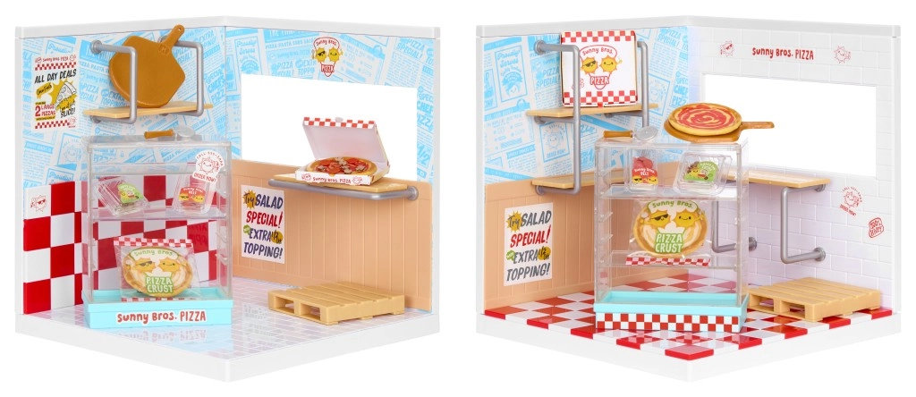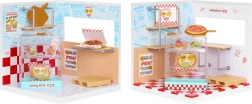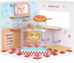 Organise la vitrine, les boîtes à pizza et le plan de travail, décore les murs et prépare une mini pizza à servir. Idéal pour jouer au service et exposer ta collection.