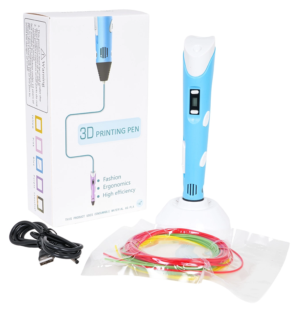 - Stylo 3D, set de recharges PLA, câble USB, mode d’emploi