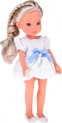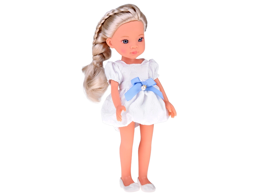 La robe blanche avec nœud bleu et petite perle, ainsi que les ballerines blanches, confèrent à la poupée du charme et un look de fête.