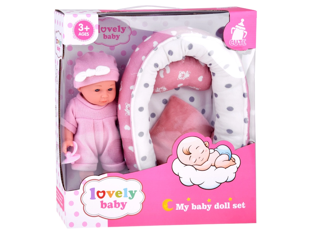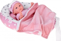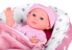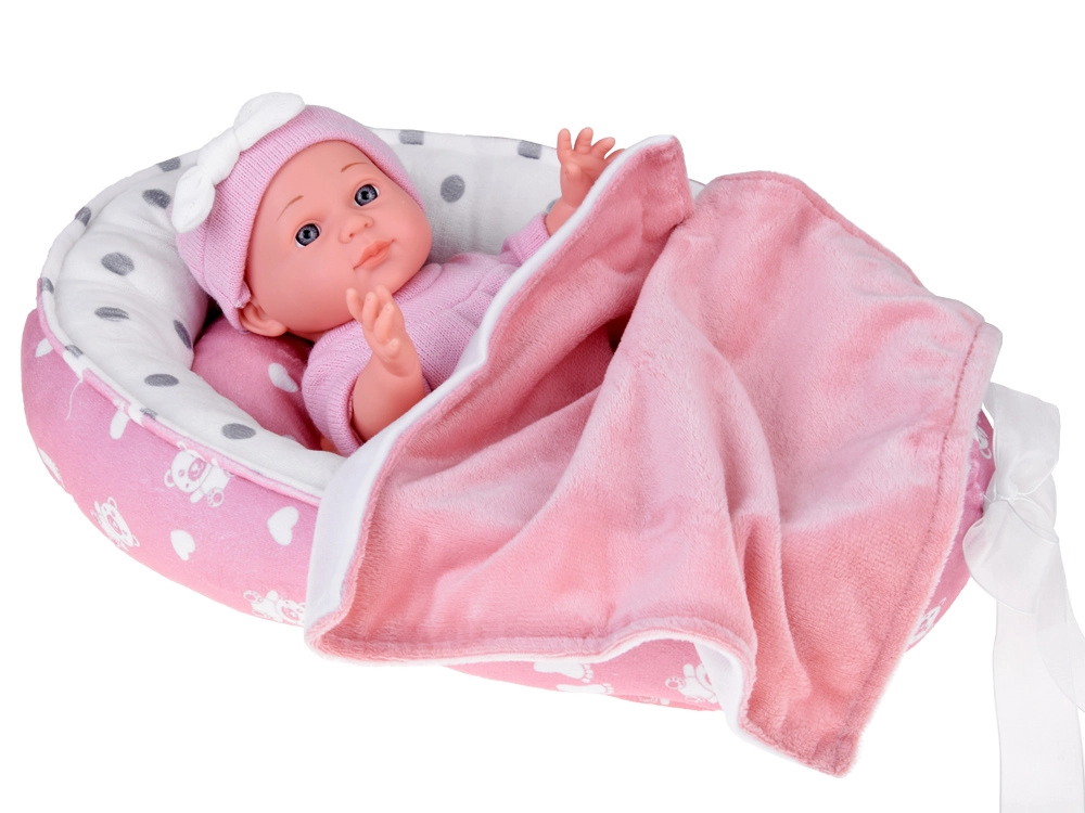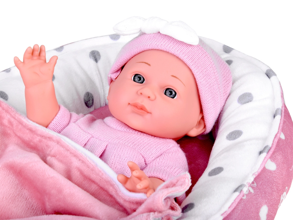 Adorable bébé en tenue rose avec un nid douillet, un petit oreiller et une couverture, offrant aux enfants un jeu de soin réaliste. Sont inclus aussi un biberon et une tétine. La poupée a des membres articulés et des vêtements faciles à retirer dans de tendres couleurs pastel.