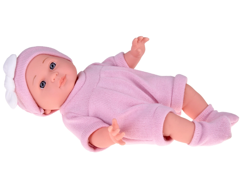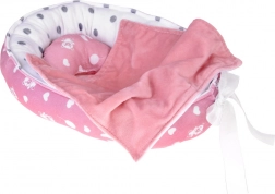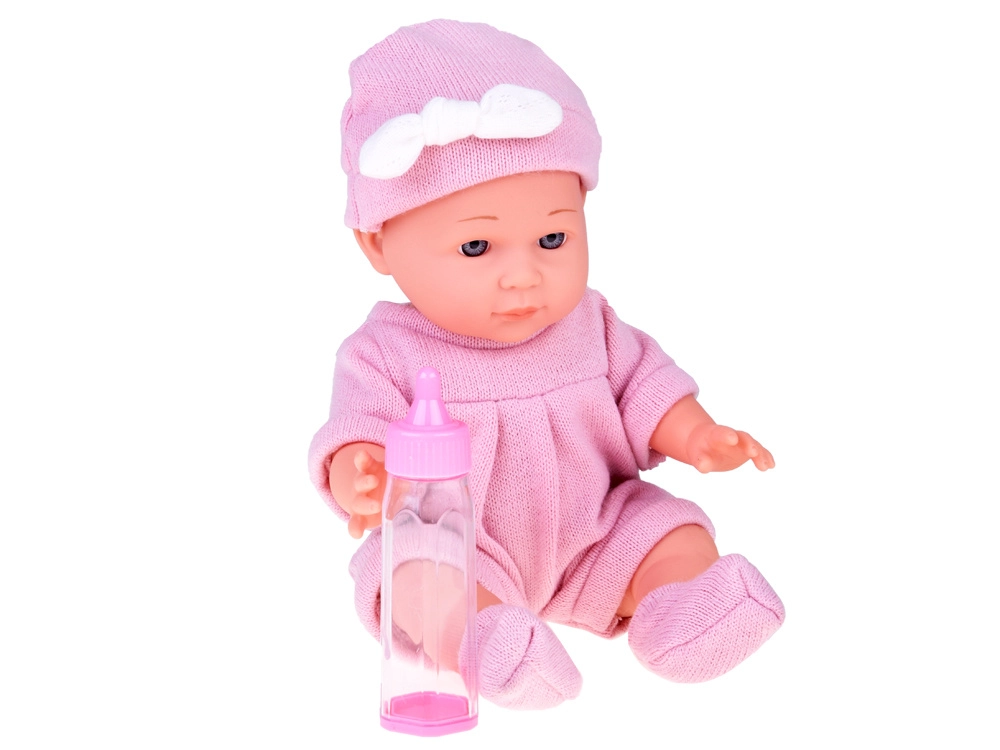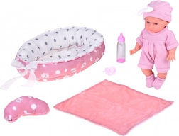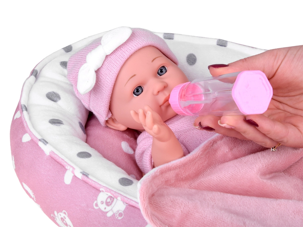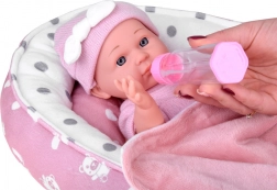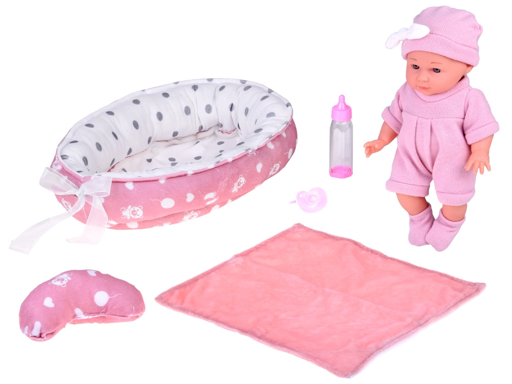 - Poupée en tenue rose avec bonnet, nid textile avec oreiller et couverture, biberon, tétine