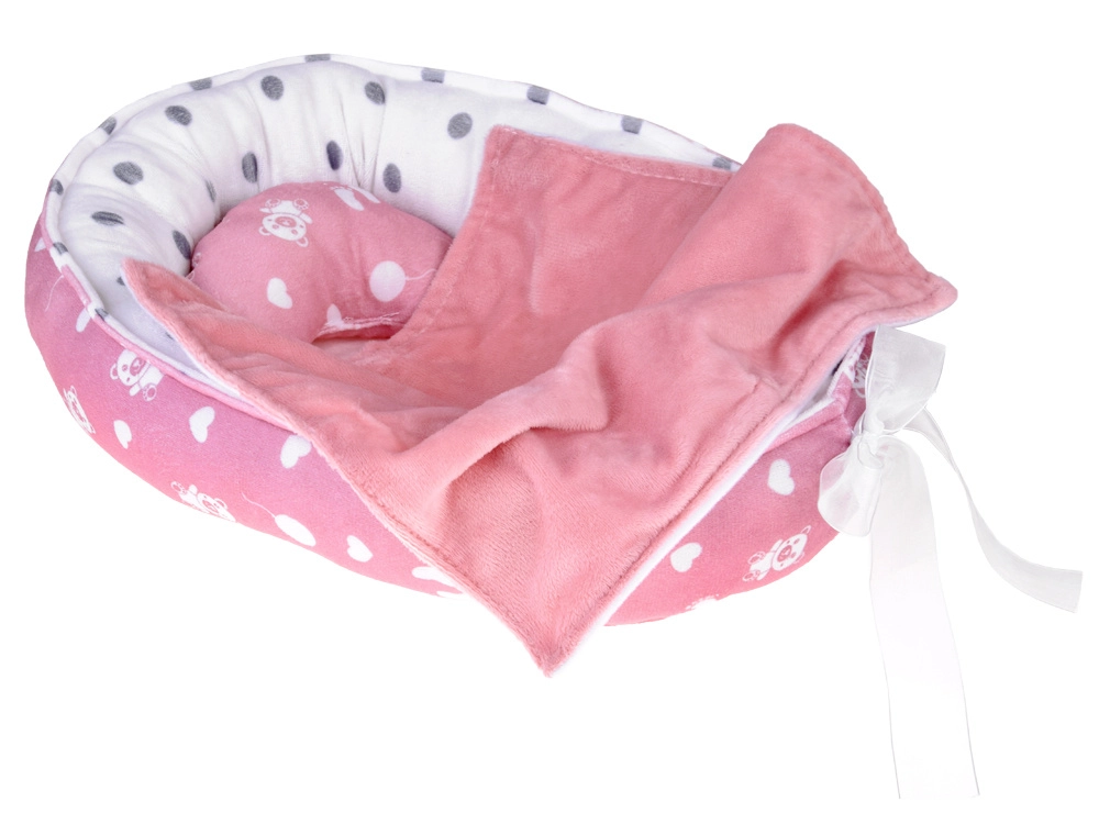 Berceau textile avec doublure à pois et nœud, offrant à la poupée un cocon chaleureux. Les enfants peuvent le transporter facilement et coucher le bébé à tout moment et en tout lieu.