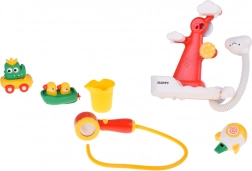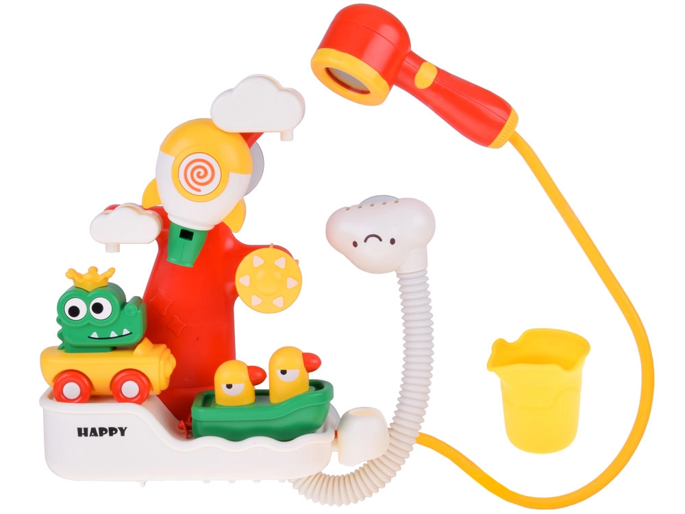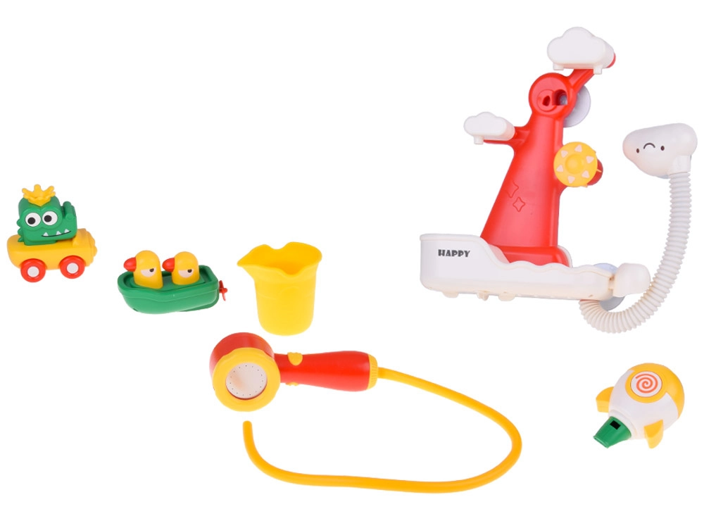 - Base avec pompe, douchette à main avec tuyau, crocodile dans une voiture, bateau avec 2 canetons, gobelet