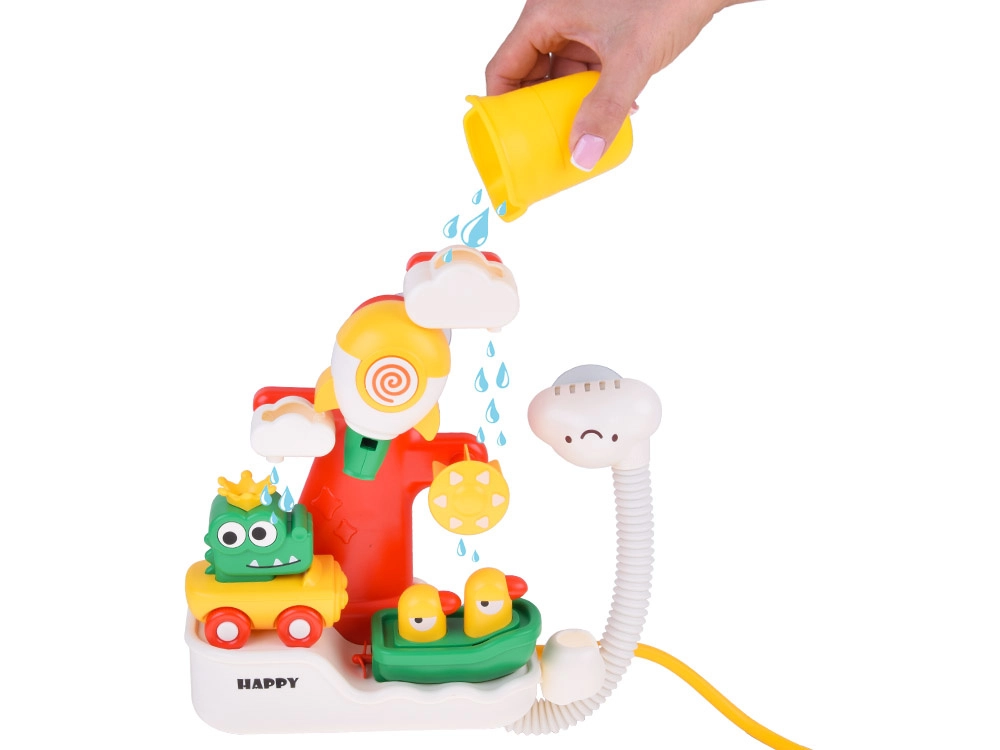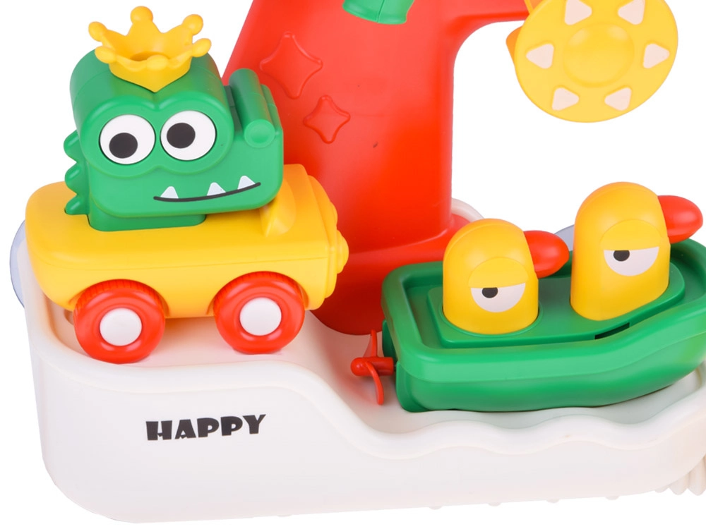 Adorable station de bain avec petit crocodile offrant aux enfants une dose infinie de plaisir aquatique. La pompe électrique fait circuler l’eau et crée l’effet de douche continue, qui met en rotation des roues et active divers effets d’eau. Sont également inclus des canetons flottants dans un petit bateau, une voiture avec crocodile et un gobelet pour verser.