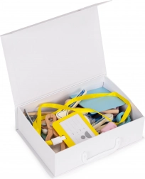 Tous les composants sont en bois durable, dans des couleurs pastel agréables, et rangés dans une mallette robuste pour un transport facile et un rangement ordonné. Grâce à son réalisme, les enfants apprennent à prendre soin des autres, développent l’imagination et la coordination œil-main.