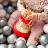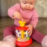 Ce carrousel rotatif coloré avec cheval et billes ravira chaque bébé. Il suffit d’appuyer sur le bouton supérieur jaune pour que le carrousel intérieur se mette à tourner – les billes s’animent et créent un spectacle captivant accompagné d’un doux cliquetis. Le jouet apporte à la fois divertissement et développement sensoriel.