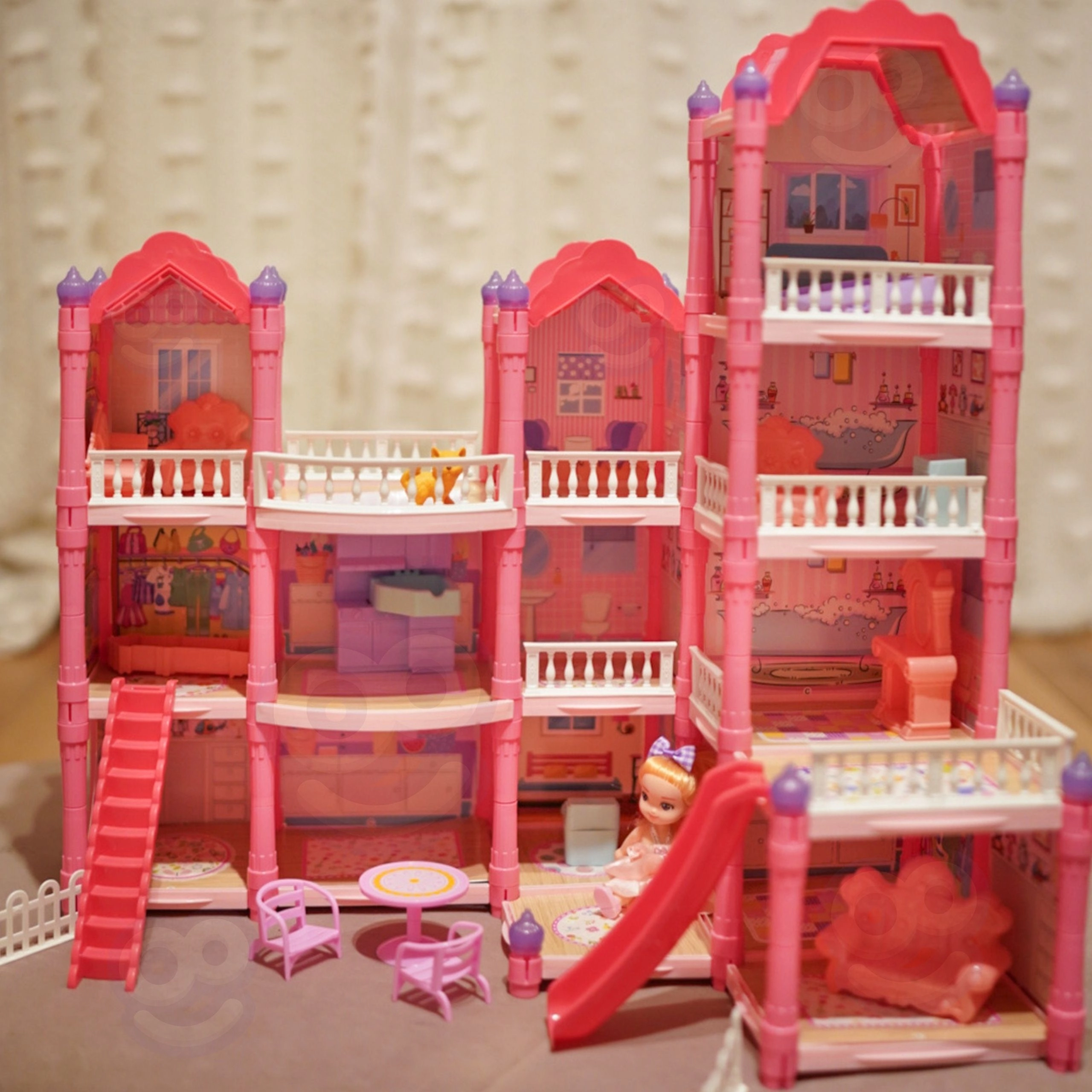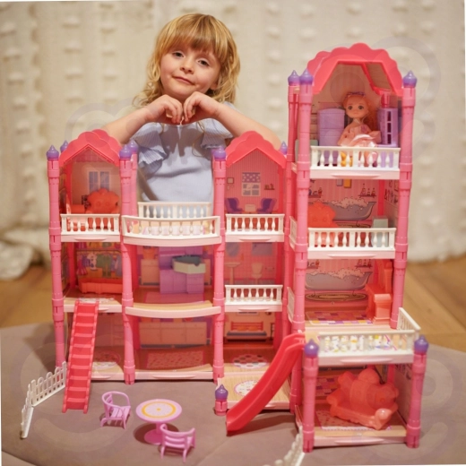 Découvrez la maison de poupées à trois étages au toit rose, richement équipée et dotée d’un éclairage nocturne. Le set propose 296 pièces, dont un ameublement adorable, des accessoires et une poupée, afin que les enfants puissent aménager chaque pièce eux‑mêmes. Toboggan, escaliers et terrasse ajoutent encore plus de plaisir et stimulent la créativité, l’imagination et la motricité fine.