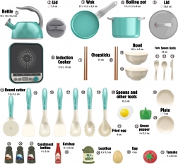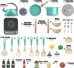 - Accessoires riches : casseroles avec couvercles, poêle avec œuf, bouilloire, assiettes et bols, couverts, légumes, épices.