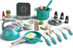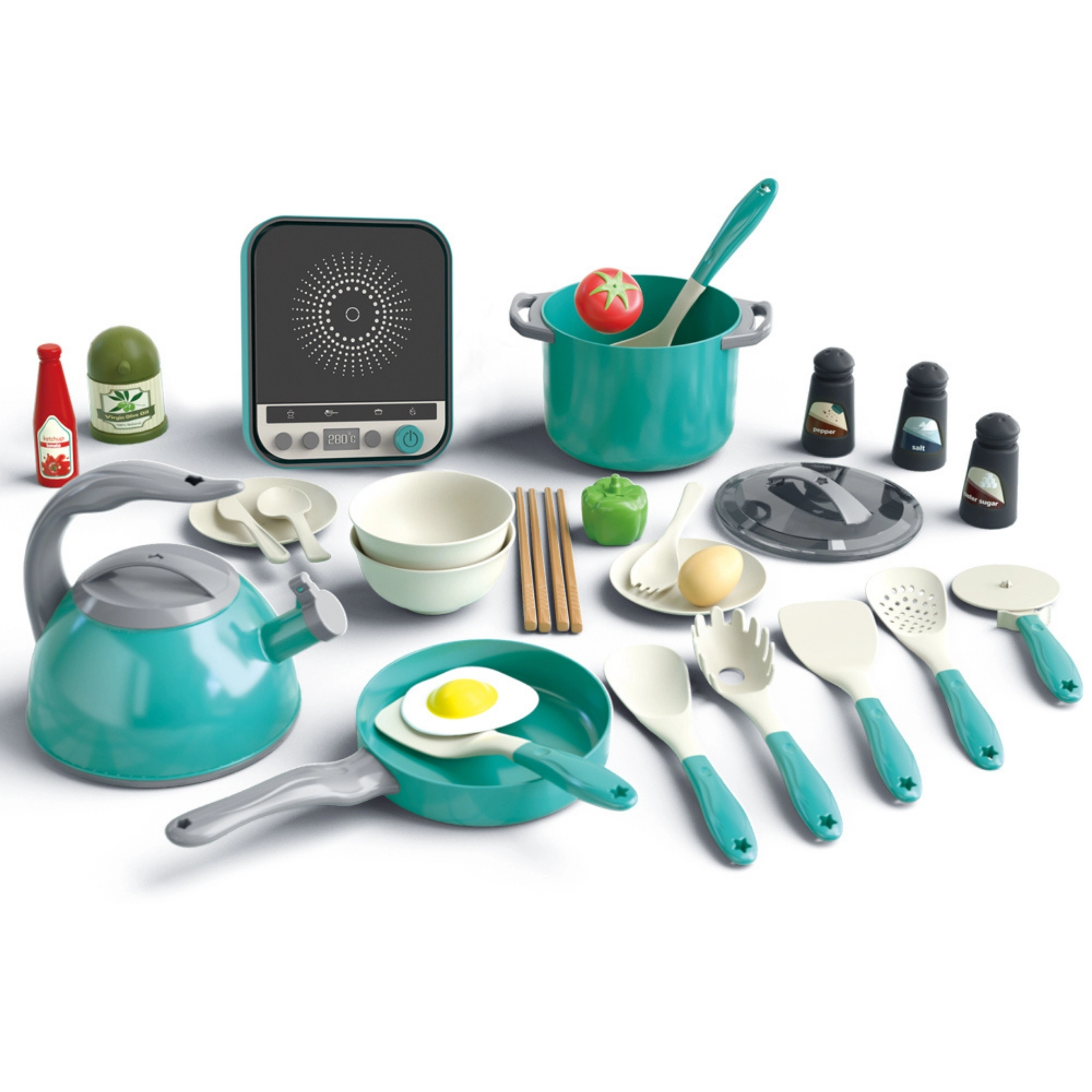Avec ce set richement équipé, les enfants plongent dans l’univers de la cuisine. La plaque à induction apporte de l’authenticité au jeu, tandis que les casseroles, la poêle avec œuf, la bouilloire et de nombreux accessoires permettent de préparer un « menu » pour toute la famille. Grâce aux accessoires réalistes, comme les légumes, la salière et la poivrière, le jeu est captivant et stimule l’imagination.