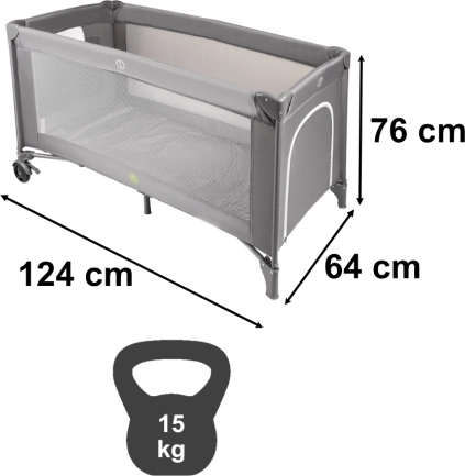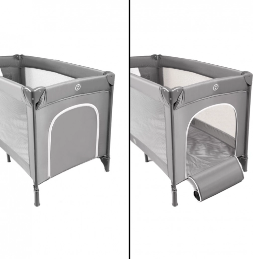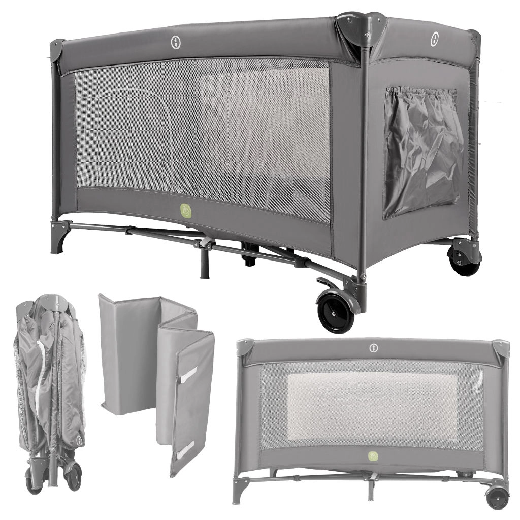 Lit de voyage léger et compact pour bébés et enfants jusqu’à 15 kg, dimensions 60 × 120 cm, offrant un montage/démontage rapide, des côtés en maille respirante pour la surveillance et la circulation de l’air, une entrée latérale zippée pour grimper et sortir seul, et une poche pratique. Inclus : matelas pliant et housse de transport.